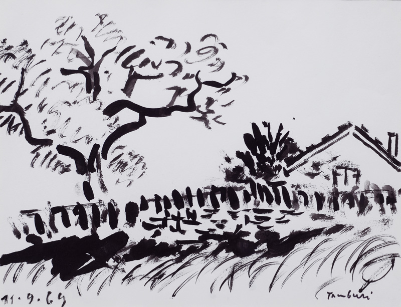 Orfeo Tamburi (Jesi, 1910 - Parigi, 1994) PAESAGGIO CON CASA, 1969 China su carta, cm. 18x23 Firma in basso a destra, data in basso a sinistra. Autentica dell’autore su foto.