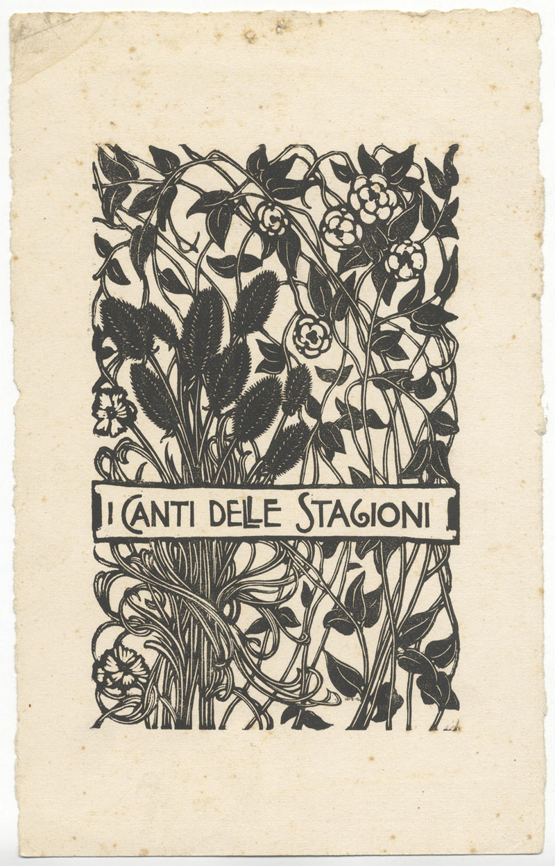 Francesco Nonni (1885-1975). Tre xilografie. Dame in giardino. 1909. Xilografia. mm 250x170. Foglio: mm 293x211. Dirani, 35. Pubblicata in Commedie di Carlo Goldoni con illustrazioni artistiche e letterarie di vari. A cura di L. Rasi. Firenze: Luigi Rasi Edit. per i tipi dell'Arte della Stampa di Salvatore Landi, 1909 (manca al centro il sonetto di Giovanni Marradi). Esemplare in prova d'artista. Illustrazione floreale con cartiglio. 1921. Xilografia. mm 170x117. Foglio: mm 240x155. Dirani, 66. Pubblicata in L. Orsini, Le campane di Ortodonico. Milano-Varese, 1921. Esemplare in prova d'artista. Scuola di disegno industriale e plastica "Tommaso Minardi" di Faenza. 1924 ca. Xilografia. mm 270x205. Foglio: mm 307x220. Dirani, 83. Siglata sul legno in basso a destra. Rarissima prova d'artista, l'unica conosciuta. Foglio 1: Bella impressione stampata con inchiostrazione fresca su carta liscia avorio. Buoni margini, un piccolissimo strappo riparato al margine destro e uno al margine inferiore, lievissime tracce di foxing nel riquadro bianco centrale. Foglio 2: Bella impressione stampata su carta calcografica pesante. Ampi margini, lievi tracce di foxing, due piccoli fori al margine superiore. Foglio 3: Bella impressione stampata su sottile carta avorio liscia. Piccoli margini, una piega orizzontale al centro, vari strappi riparati, residui di nastro adesivo e lievi tracce di foxing.