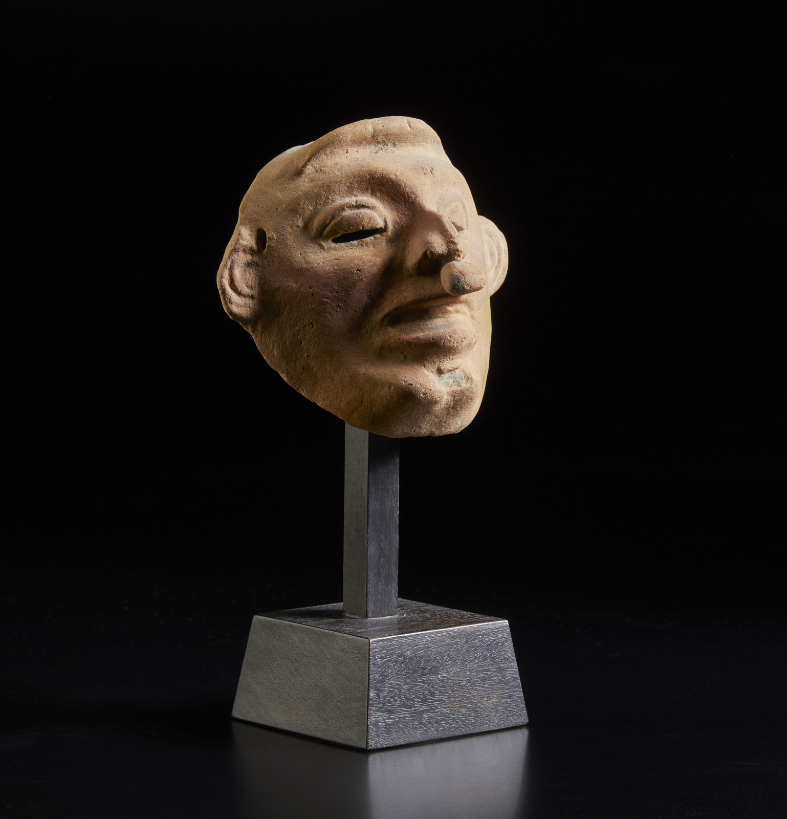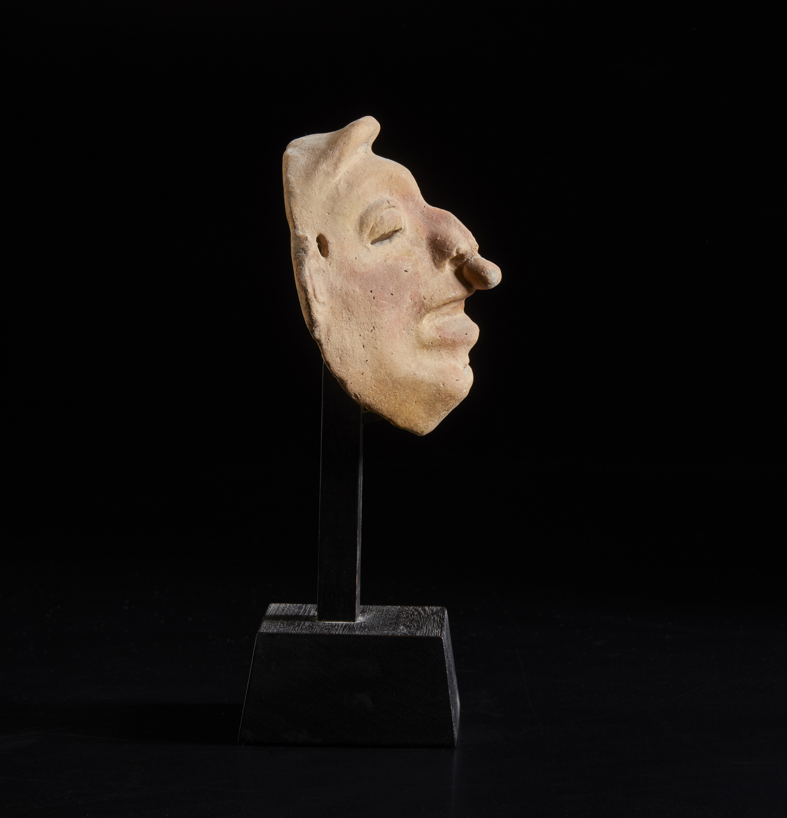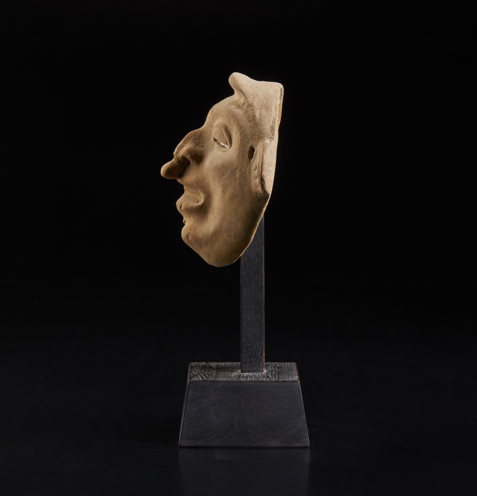500 a.C.- 500 d.C. . Cm 14,00 x 12,00 x 7,00. Maschera di "vecchio" in terracotta, di grande espressività.