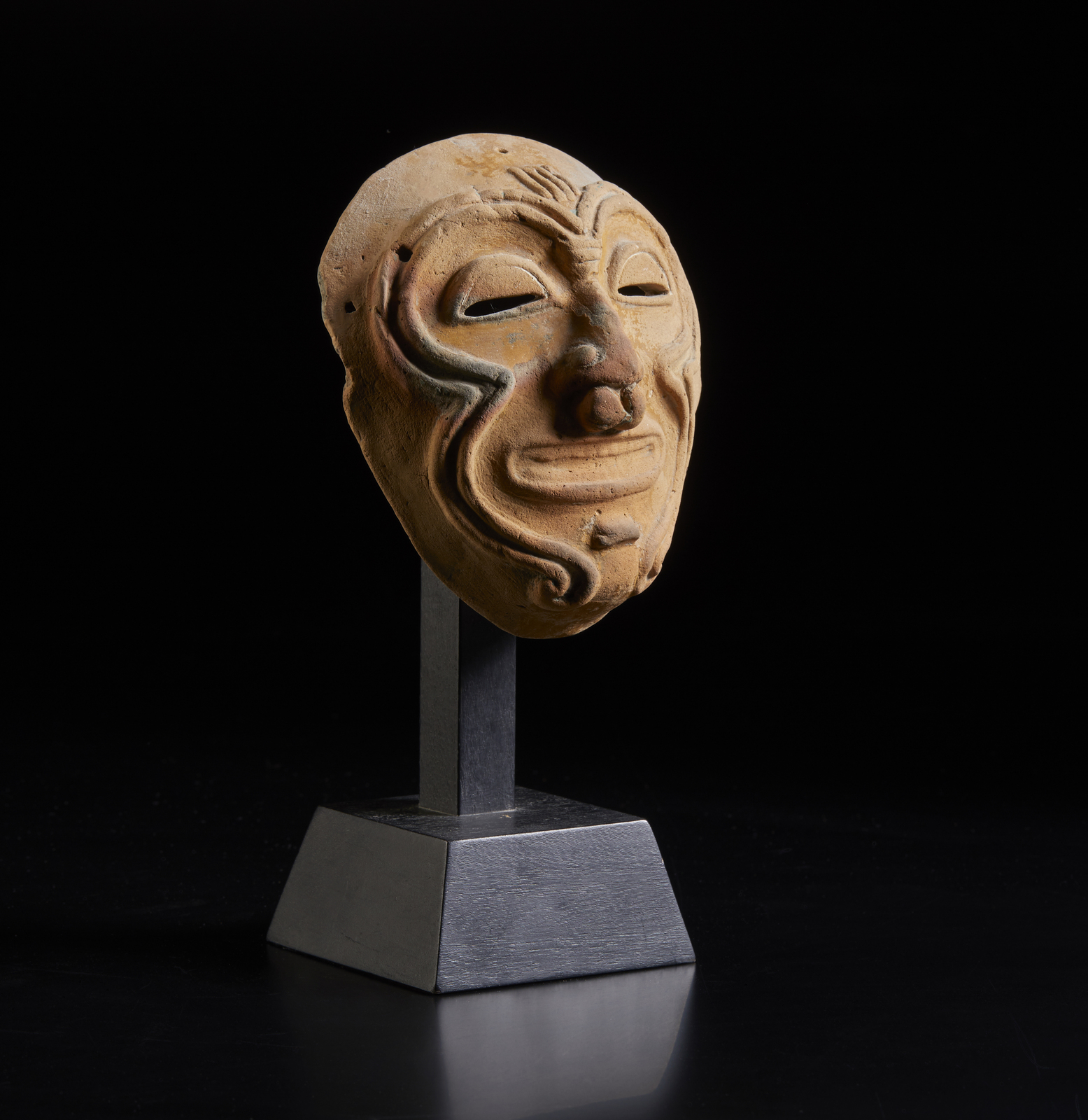 Arte dell'America del Sud - Ecuador, Jama Coque. Maschera in terracotta con nariguera e piccola visiera. 500 a.C. - 500d.C. .