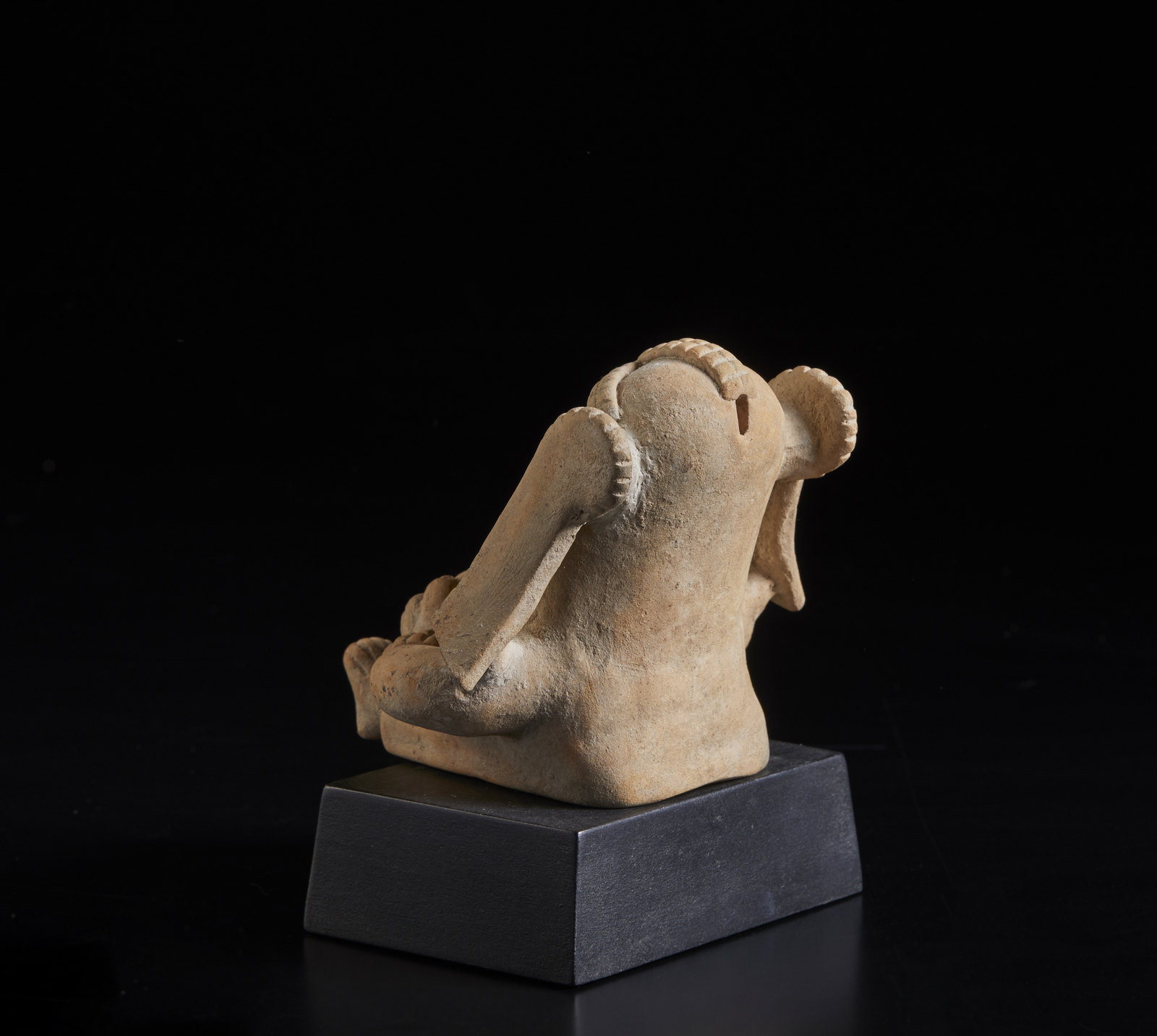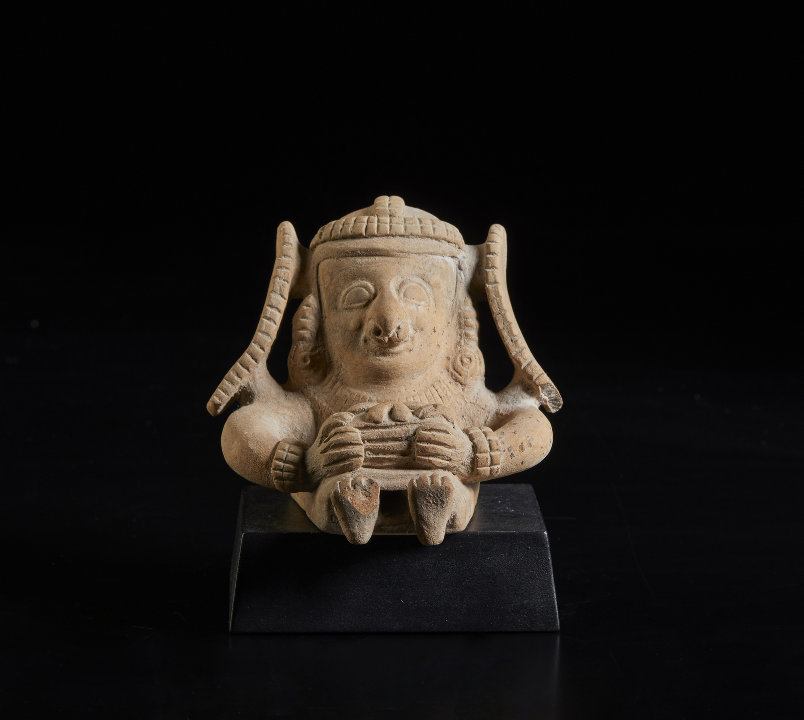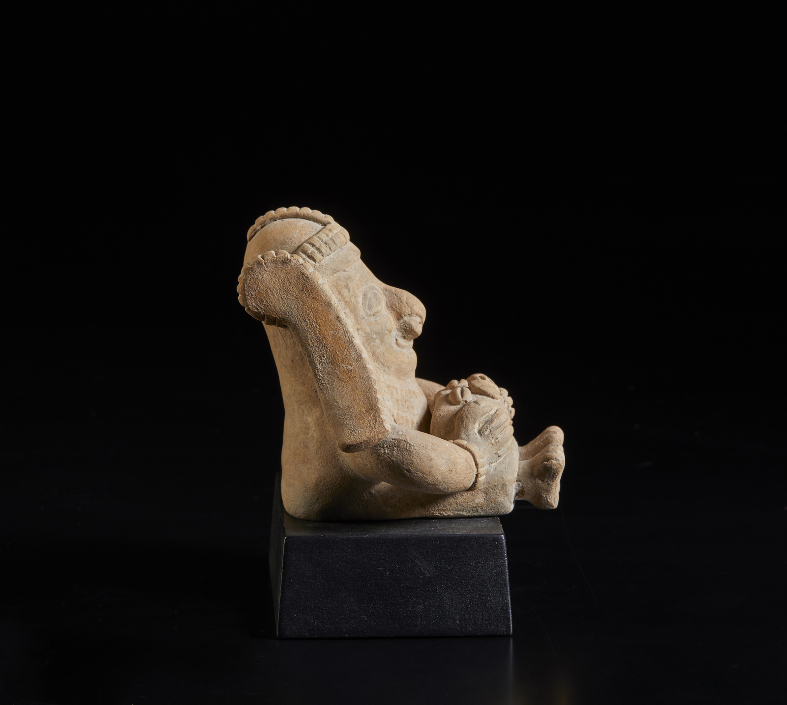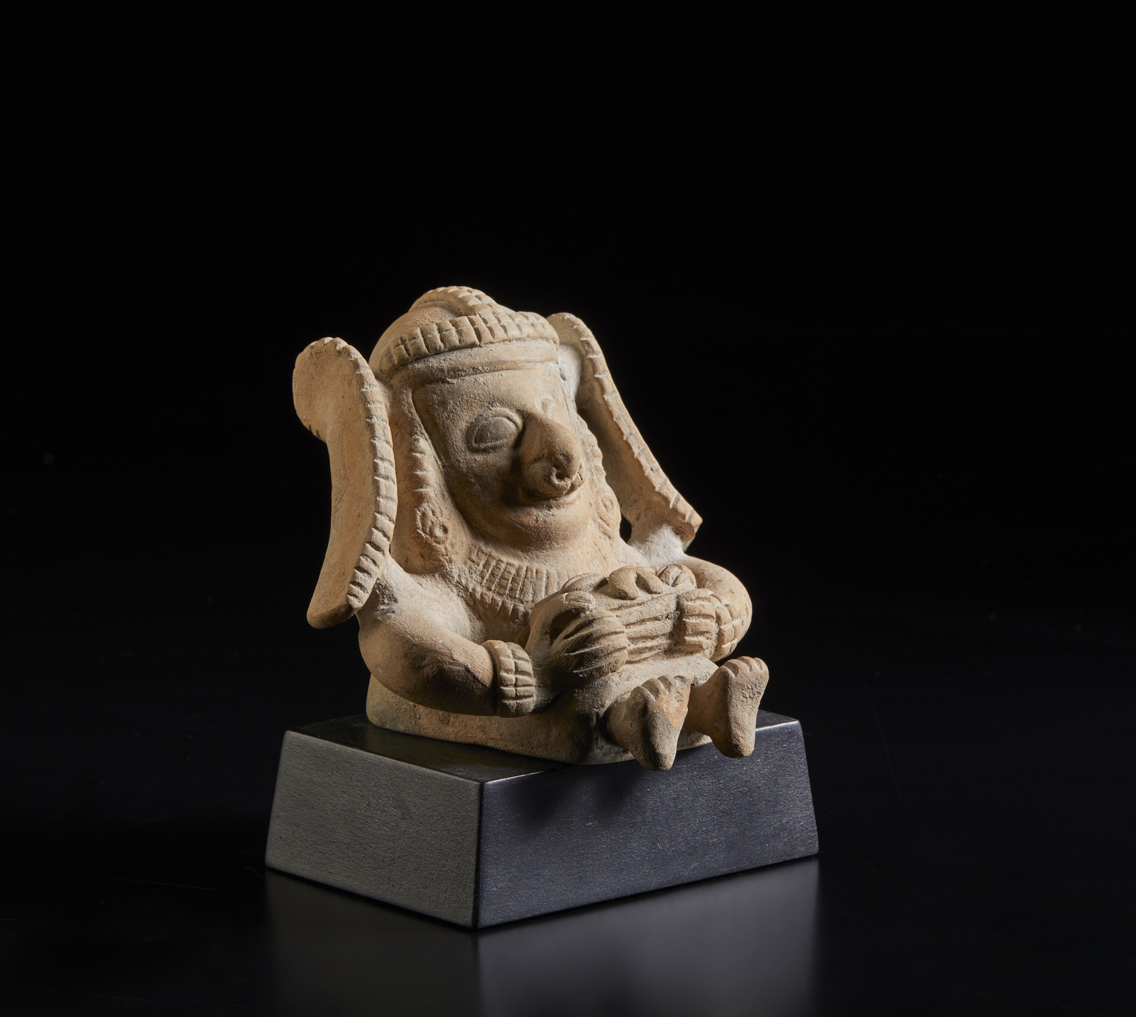 Arte dell'America del Sud - Ecuador - Jama- Coaque. Raffigurazione di orafo seduto con importanti parametri riturali e strumenti di lavoro in grembo. 500 a.C.- 500 d.C.