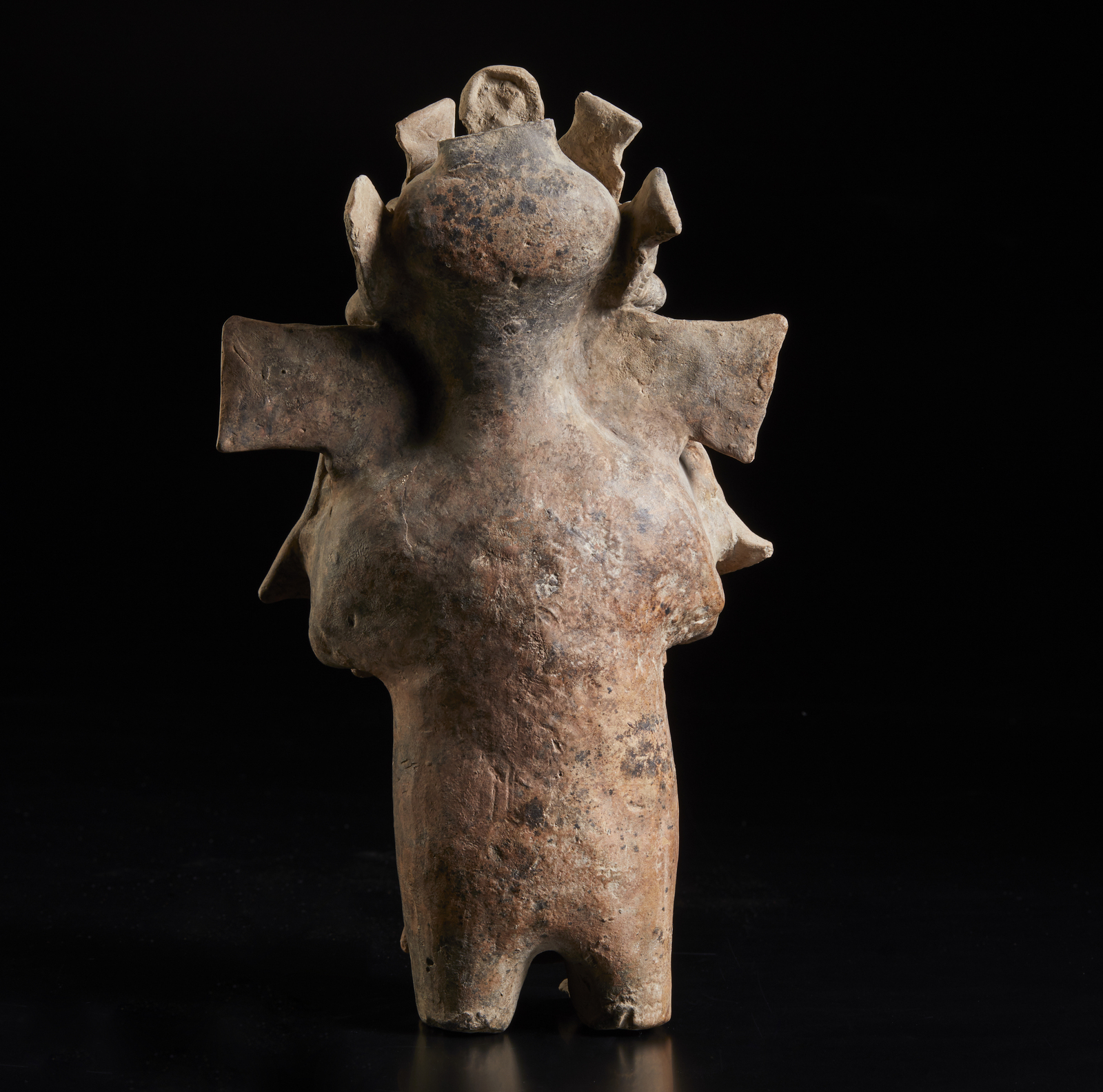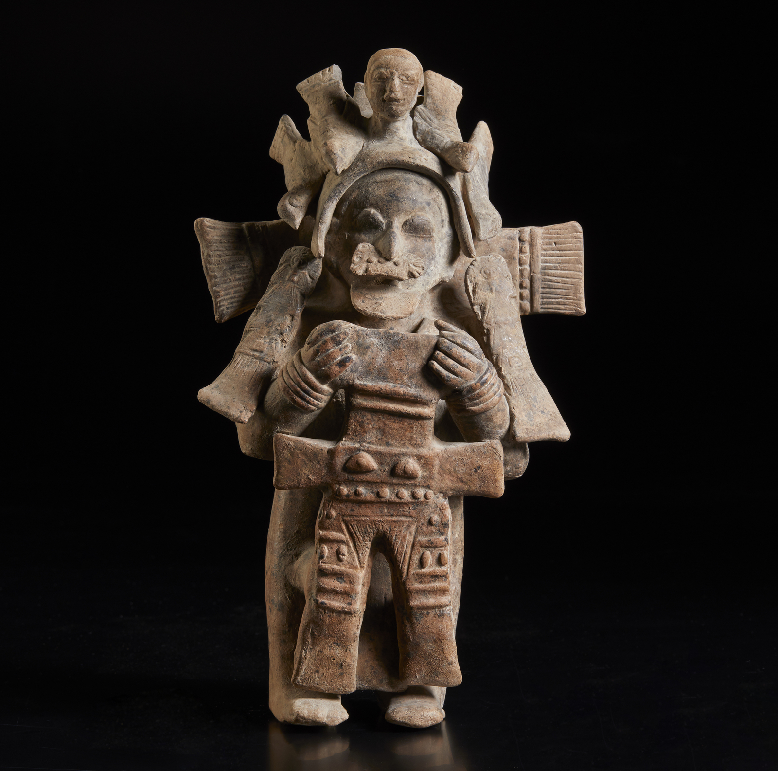 300 a.C. - 800 d.C. . Cm 17,00 x 29,00 x 9,00. Raro ed eccezionale personaggio che reca attorno alla testa pesci, uccelli e una testa mozzata. Sul davanti è visibile un emblema che doveva essere ricoperto dalla pelle umana di un guerriero abbattuto. Si tratta della rappresentazione di un TSANSERO o riduttore di teste.