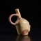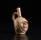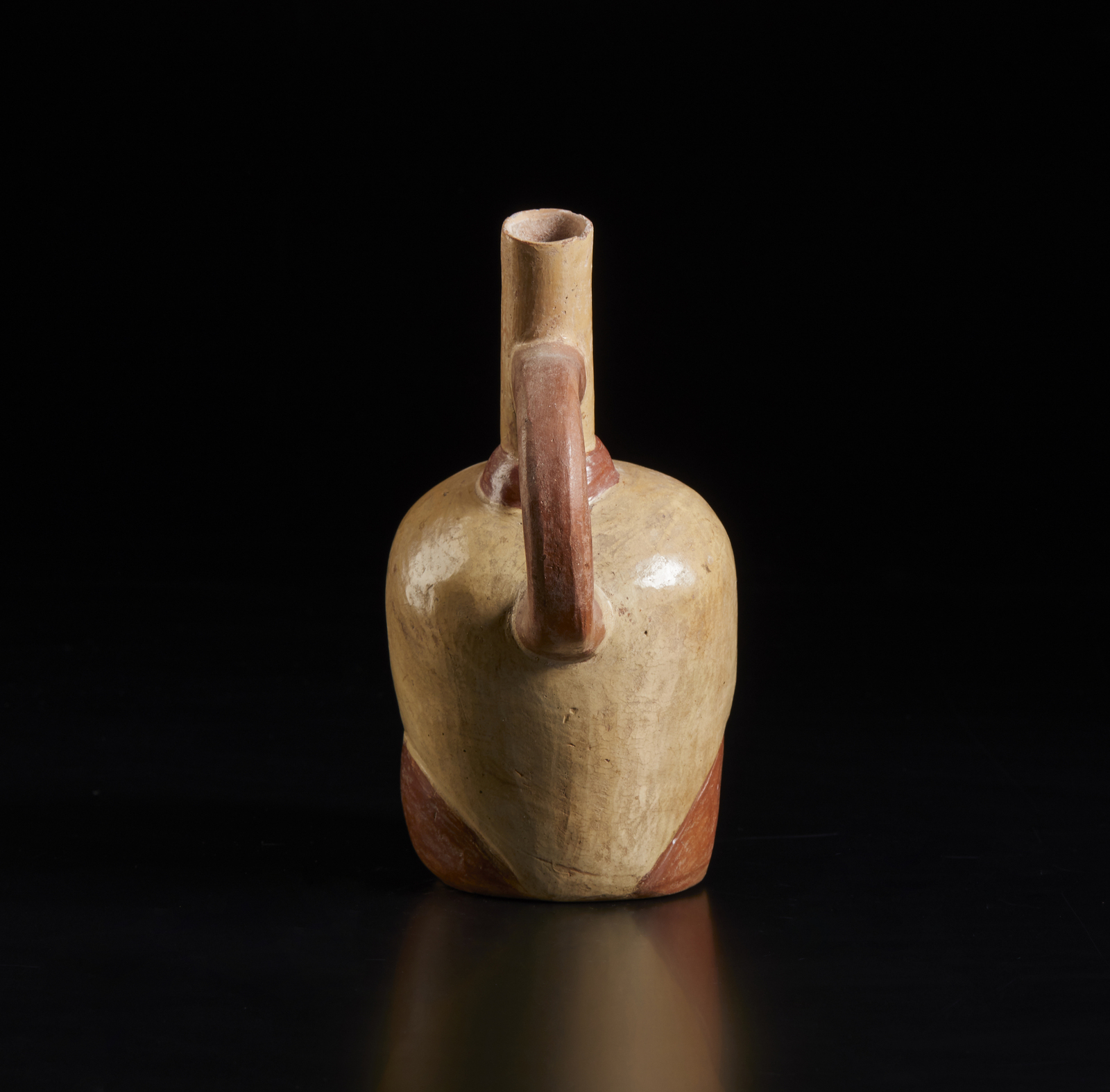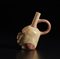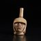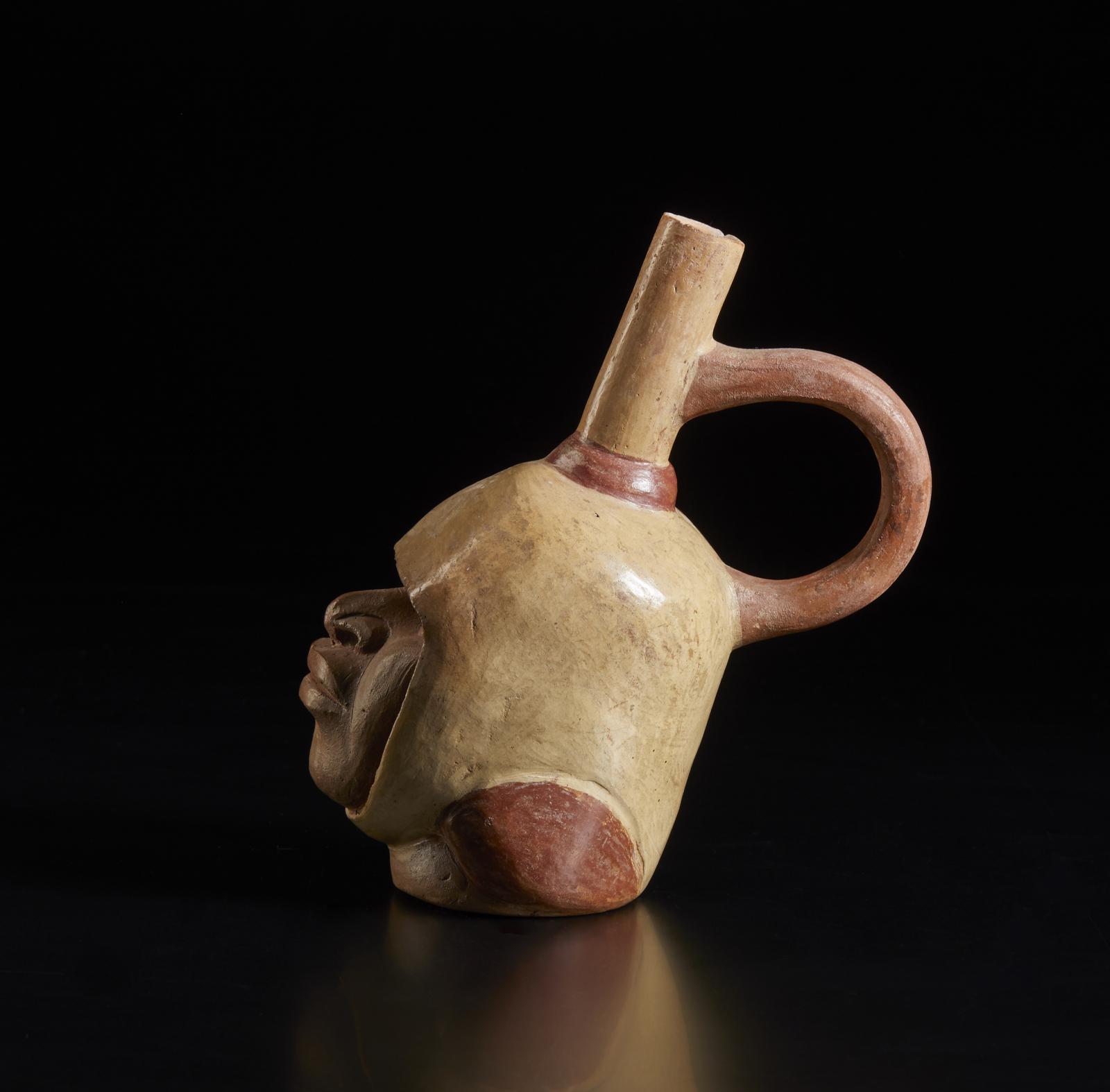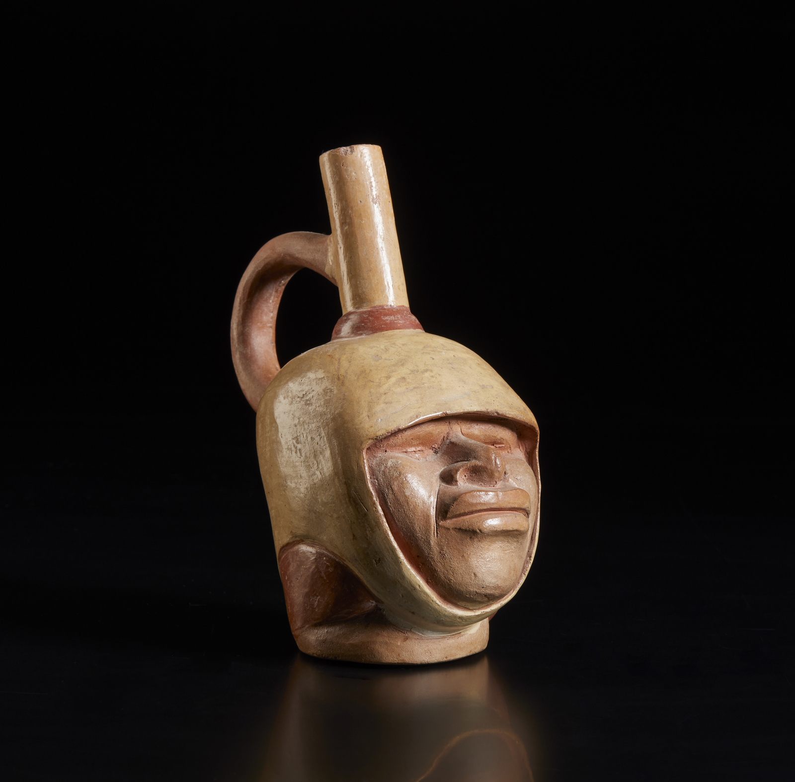 II sec. a.C. - VIII sec. d.C. . . Cm 10,00 x 19,80 x 18,00. Bottiglia in ceramica lavorata a stampo, ingobbiata in color mattone e dipinta in tricromia (ocra, mattone, e rosso mattone); cottura ossidante (presenza "nubi" di cottura). La camera rappresenta, a tutto tondo, il ritratto di un indio cicco con copricapo; le caratteristiche somatiche tipiche delle rappresentazioni della cultura in esame sono rese con rese con notevole marcatura.