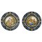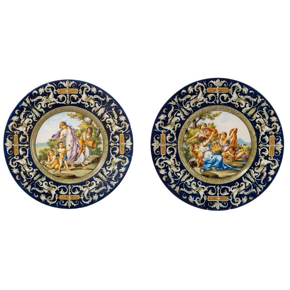 Coppia di grandi piatti in ceramica smaltata e decorata con medaglioni raffiguranti scene mitologiche.