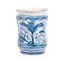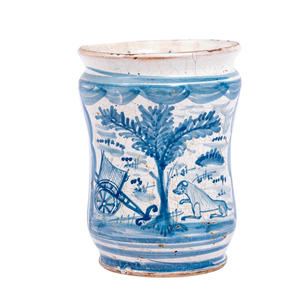 Cilindro in ceramica smaltata e decorata nei toni dell'azzurro su fondo chiaro raffigurante paesaggio.