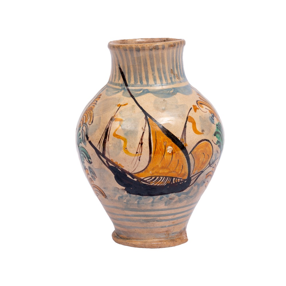 Boccia in ceramica smaltata e decorata con decoro raffigurante barca a vela (usure e mancanze).