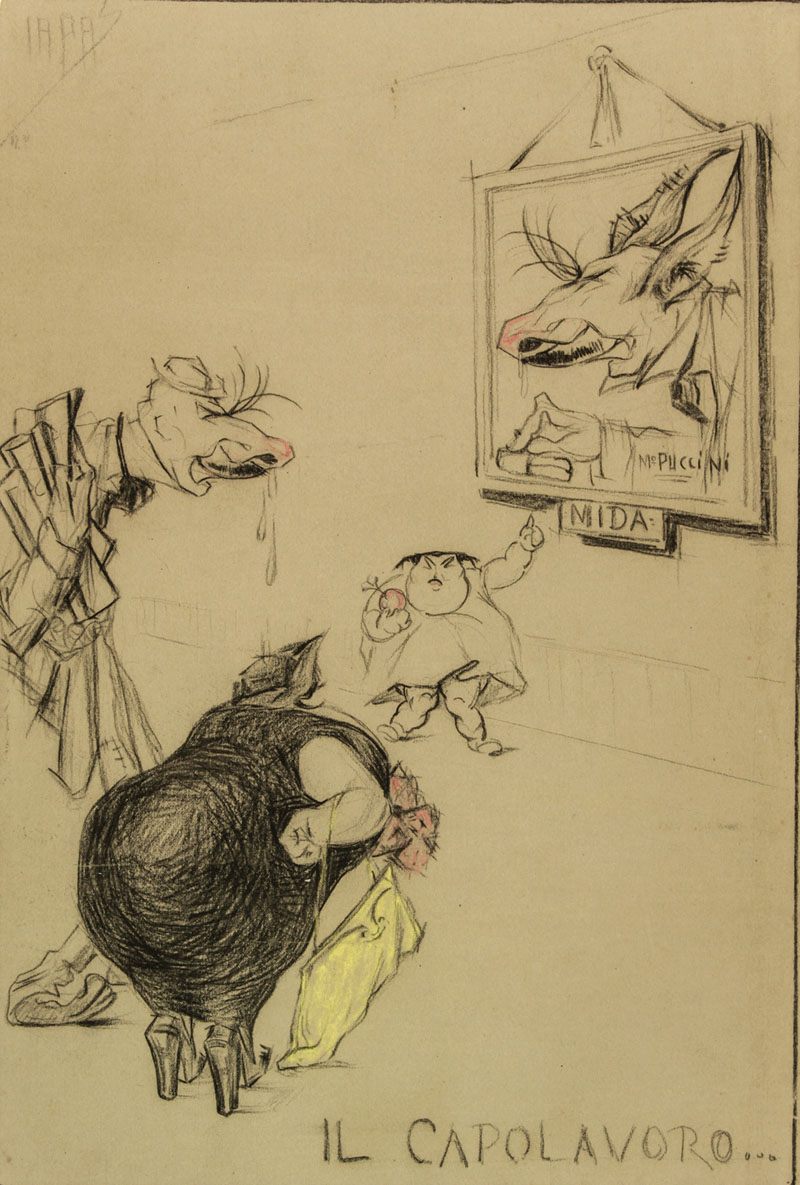 Italo Amerigo Passani (1882-? ). Il capolavoro. 1920. Carboncino e matita colorata su carta grigia mm. 460x310. Firmato e datato "IAPAS 20" in alto a sinistra. Sono riconoscibili le caricature del collezionista di quadri ingegnere Emanuele Rosselli, la signora Bruna Rosselli e Mario Galli che indica un quadro firmato da Mario Puccini raffigurante il Rosselli in veste di re Mida con le orecchie d'asino. Una piccola mancanza all'angolo superiore sinistro.