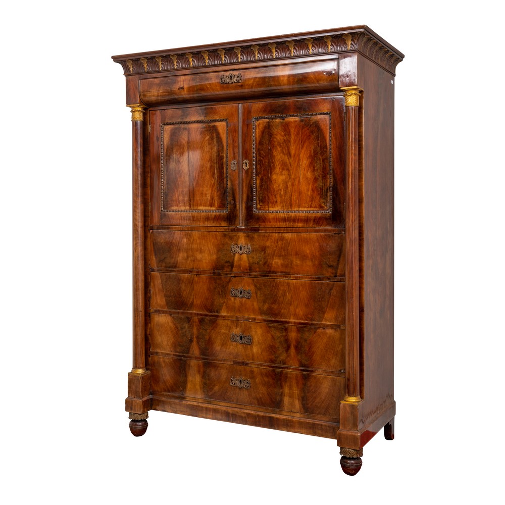 CHIFFONIERE Impero in mogano e piuma di mogano con due sportelli e cassettini interni.