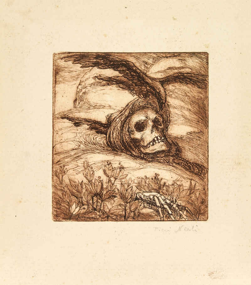 Mario Pieri Nerli (1886-1917). La Morte. Acquaforte in bistro mm 160x145. Foglio: mm 380x275. Firmata a matita in basso a destra "Pieri Nerli".Acquaforte inedita e molto rara. La singolare opera pittorica ad acquarello di Pieri Nerli, spesso densa di risvolti fantastici e grotteschi, è stata riunita per la prima volta pochi anni fa alla Palazzina delle Arti di La Spezia, rivelando l'artista al contesto di cultura internazionale sorto intorno allo storico Caffè Bardi di Livorno all'inizio del Novecento, che ebbe numerosi contatti anche con l'ambiente artistico spezzino dello stesso periodo, tramite figure di intellettuali a cerniera fra i due territori come Ettore Luigi Serra – il primo editore di Ungaretti - Roberto Galeazzi, gli xilografi de L'Eroica. Si veda: Mario Pieri-Nerli, 1886-1917: itinerari del simbolo tra Livorno e il Golfo della Spezia, a cura di Francesca Cagianelli, Marzia Ratti e Franco Sborgi, catalogo della mostra, La Spezia 2008, Livorno 2008. Bella impressione su carta martellata color crema, margini intonsi. Tracce di sporco marginali.