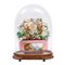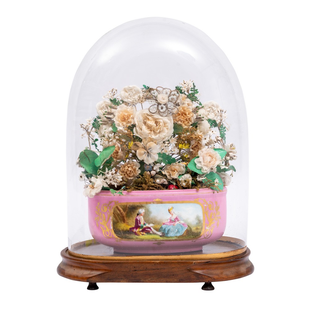 FIORIERA in porcellana con composizione in tessuto entro campana in vetro.