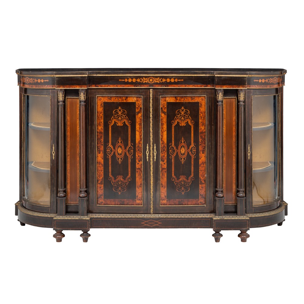 CREDENZA Vittoriana a quattro ante bombata lateralmente in legno ebanizzato con tarsie in bosso e fregi in metallo.