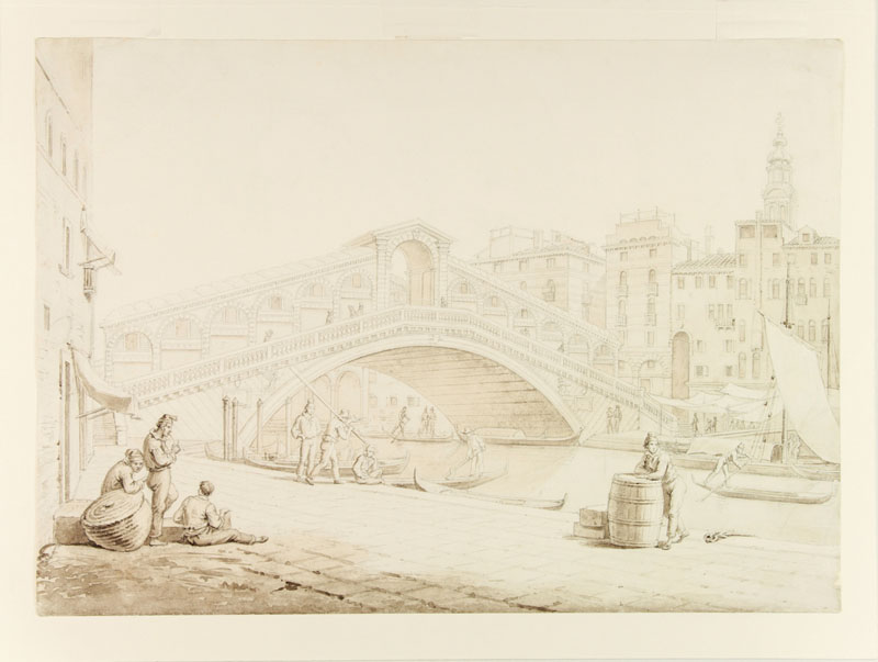 Bartolomeo Pinelli (1781-1835). Il Ponte di Rialto. 1810 ca. Penna e inchiostro acquerellato, matita nera, matita di grafite, su carta bianca compatta. Foglio: mm 295x410. Opera di qualità grafica altissima, perfettamente coerente con le opere dell'artista databili al primo decennio del XIX secolo, e, più in particolare con gli acquerelli di soggetto popolare che sfociarono poi nelle 50 stampe della prima Raccolta di Costumi di Roma (cfr. N. Di Benedetto, 2004). In eccellenti condizioni di conservazione, il foglio presenta rare spellature agli angoli e ai lati e un'antica traccia di precedenti incollaggi lungo i quattro bordi del verso; è attaccato al supporto sottostante per tre strisce di carta giapponese incollate lungo il bordo superiore, dal verso.