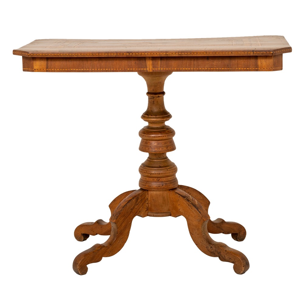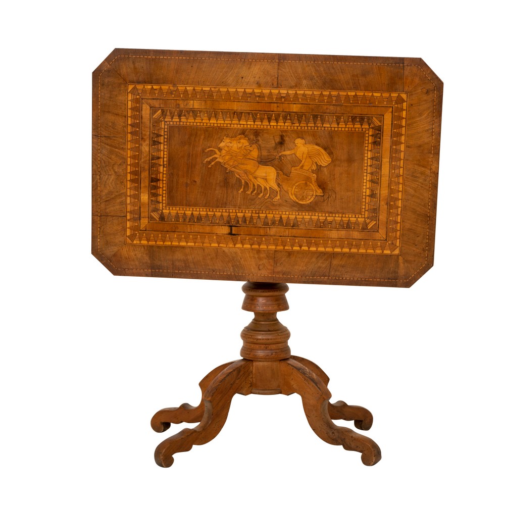 Tavolino di forma rettangolare in legno di noce e con intarsio centrale in bosso raffigurante biga con cavalli.