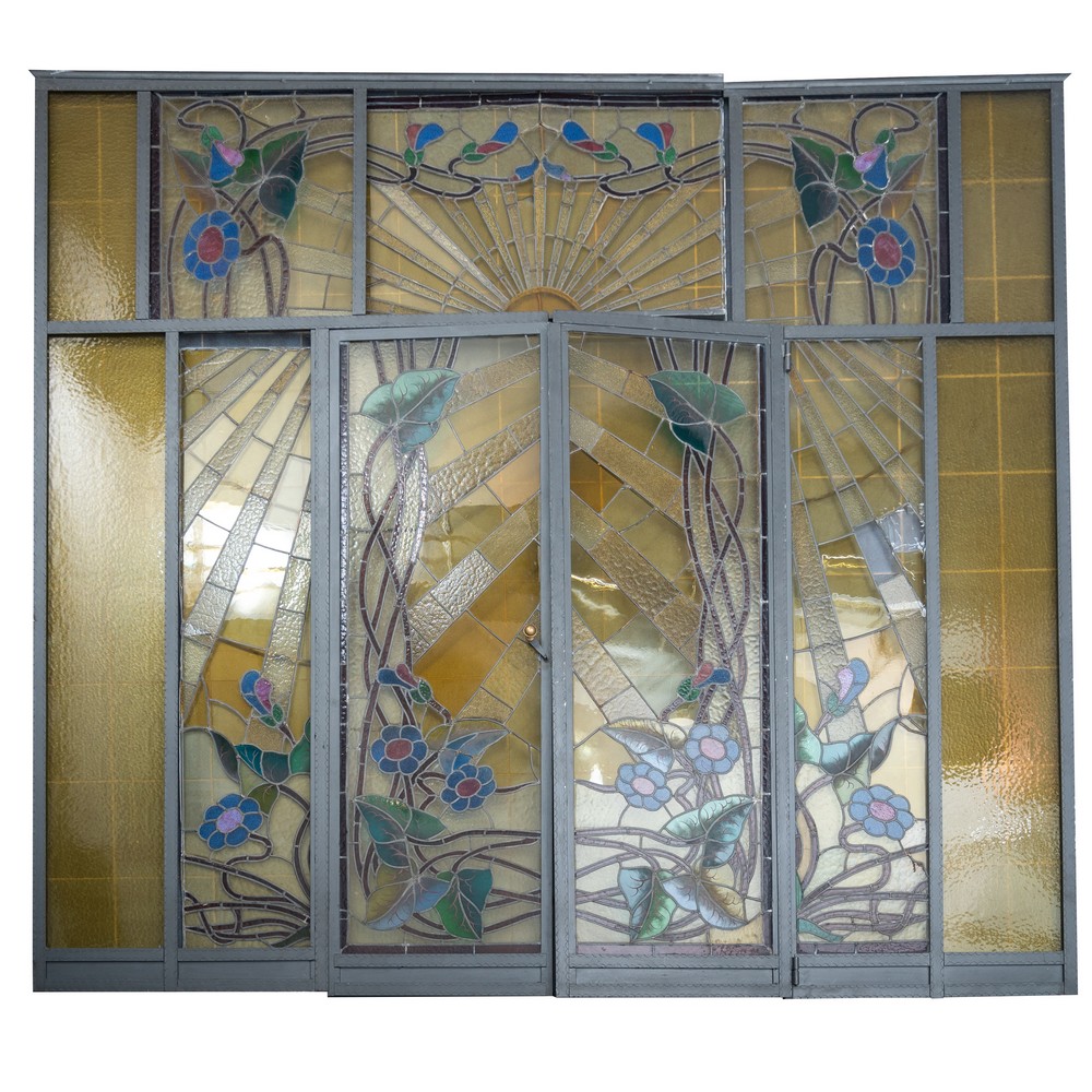Grande vetrata Liberty con struttura in ferro, due ante laterali.