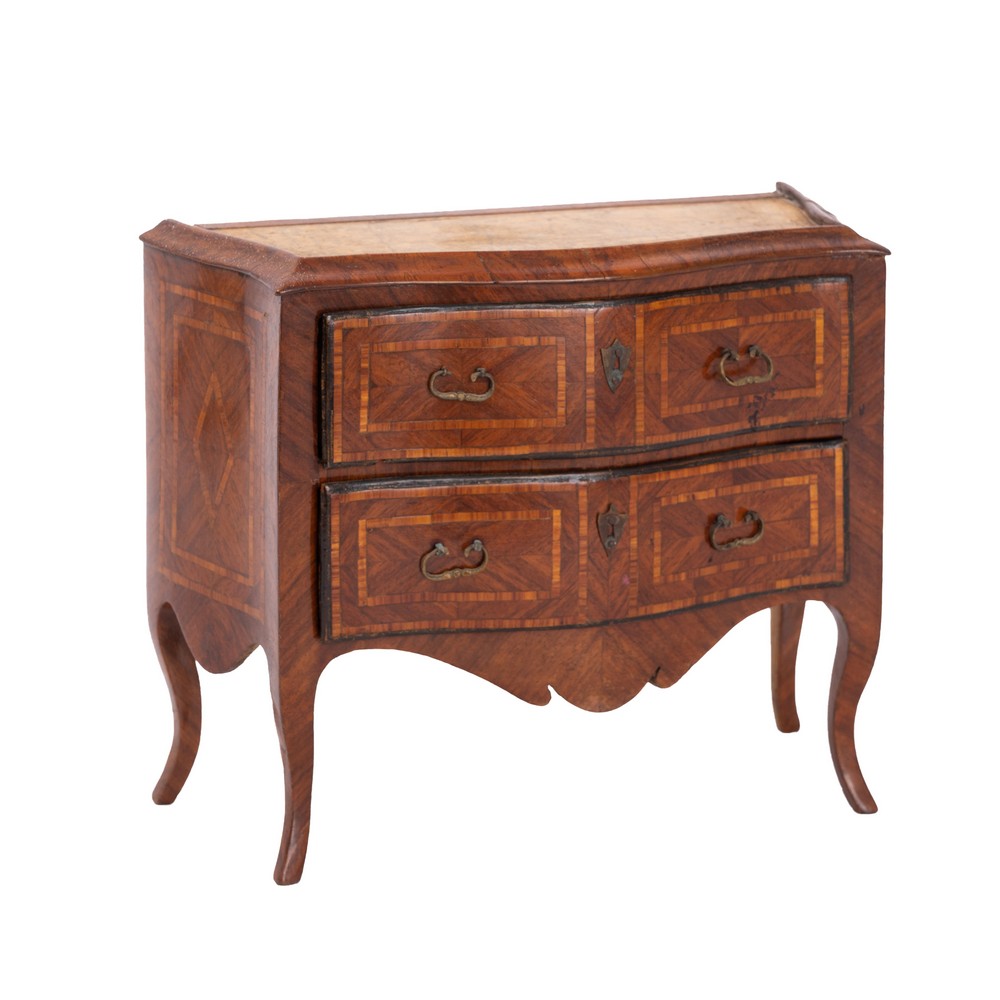 Modello in miniatura di cassettone Luigi XIV in ebano con perfili in legno di rosa, piano in marmo giallo di siena.
