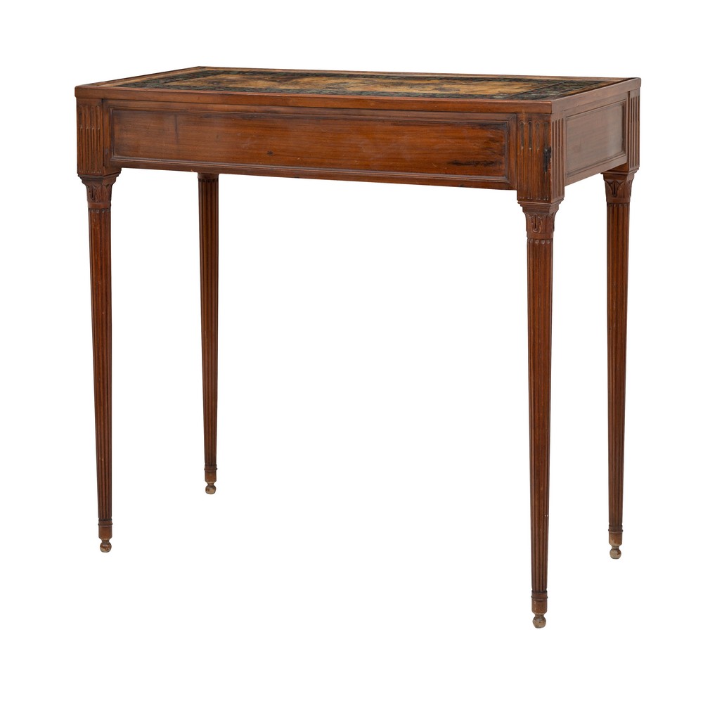 Consolle Impero in legno di mogano con piano in scagliola decorato a motivo floreale e fogliaceo.