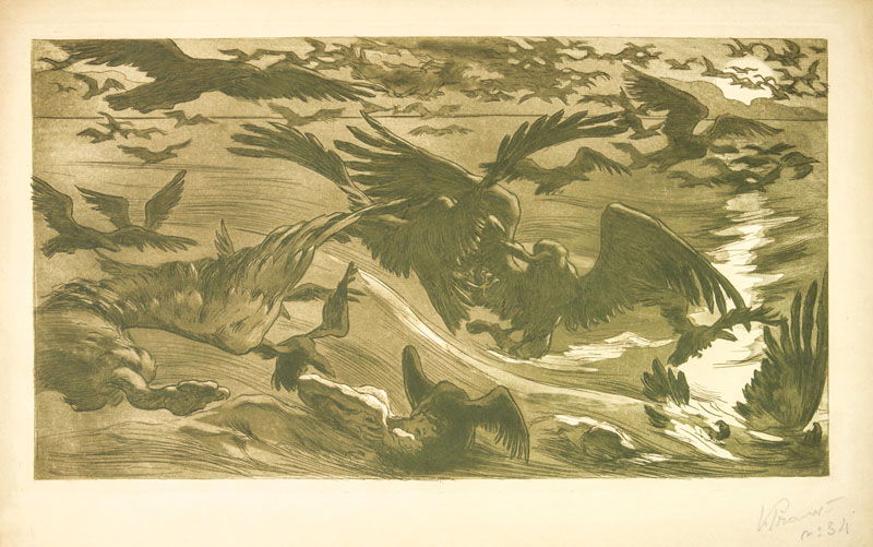 Victor Prouvé (1858-1943). Oiseaux de proie (Uccelli rapaci). 1893. Acquaforte e acquatinta. mm 239x422. Foglio: mm 286x457. Stein/Karshan, 55. Firmata e numerata «n: 34» a matita in basso a destra. Tiratura a 100 esemplari. Pubblicata in "L'Estampe Originale", importante rivista trimestrale diretta da André Marty fra il 1893 ed il 1895. Bella impressione in verde oliva stampata su carta vergellata pesante. Buoni margini rifilati (manca il timbro a secco "L'Estampe Originale" nell'angolo inferiore sinistro), lievi tracce di sporco sulla superficie, residui di vecchio montaggio al verso, ma ottima conservazione.