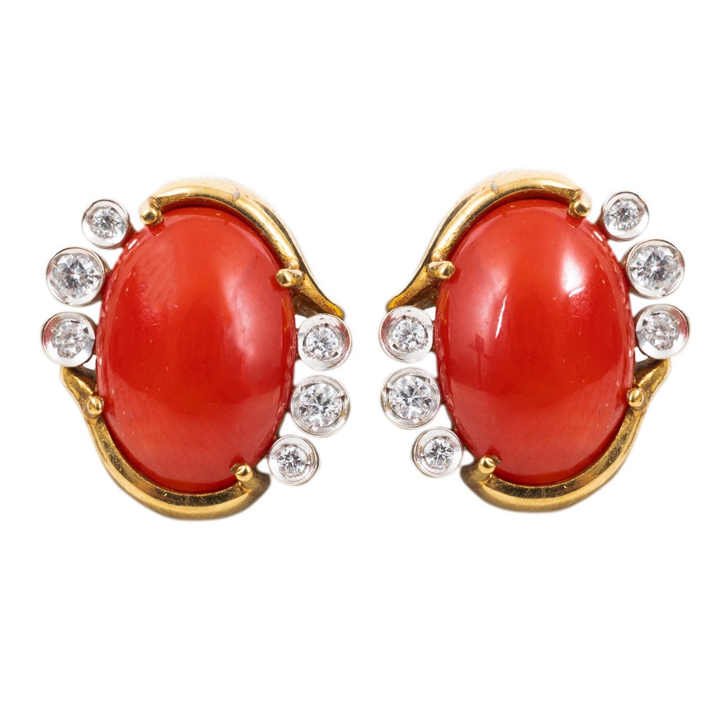 PARURE composta da orecchini e anello in oro giallo e bianco 18 KT con diamanti taglio brillante ct. 0,40 peso di stima, I color VS1 e cabochon di corallo rosso (g. 21,20).