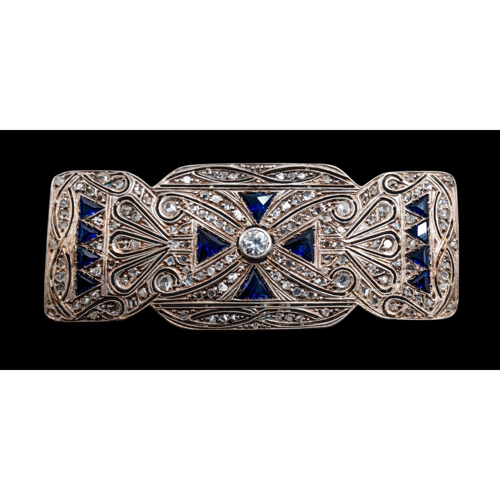 SPIALLA Decò in oro giallo 18 KT e argento con diamante centrale taglio antico ct. 0,30, diamanti taglio rose ct. 0,40 e zaffiri naturali taglio triangolo ct. 1,00 peso di stima (g. 10,00).