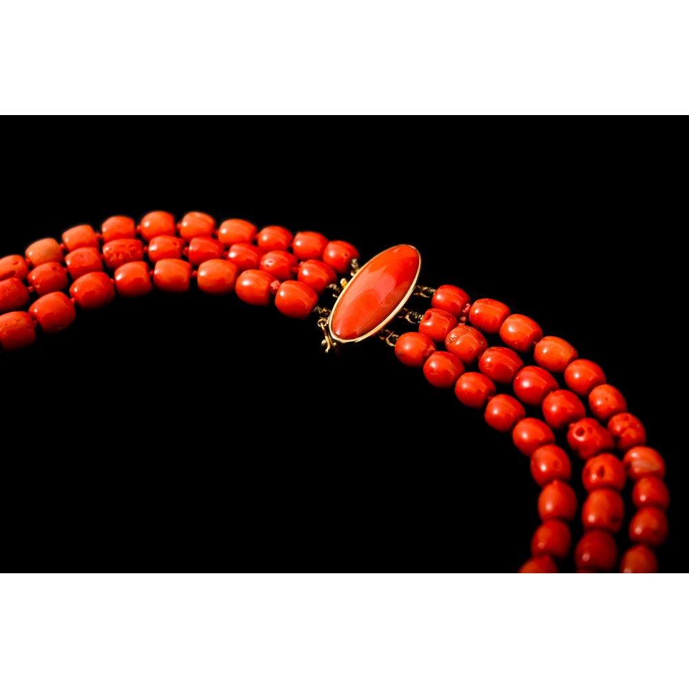 COLLANA a tre fili di corallo, susta in oro giallo 18 KT