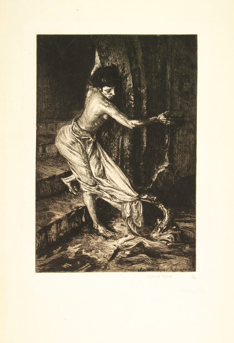 Marcel Roux (1878-1922). Embûche (Agguato). 1907. Acquaforte. mm 320x210. Foglio: mm 502x368. Firmata, titolata e datata sulla lastra in basso a destra. Firmata, titolata e numerata «1/100» a matita in basso a destra. Nona tavola da Variations, serie di nove acqueforti sul tema della femmina tentata dal peccato, eseguite dal 1906 al 1908 ed esposte alla retrospettiva su Marcel Roux al Salon d'Automne di Lione nel 1922. Bella impressione stampata con ottima inchiostrazione e forte effetto plate-tone su carta avorio pesante. Grandi margini, lieve ossidazione del foglio, residui di vecchio montaggio al verso, ma ottima conservazione.