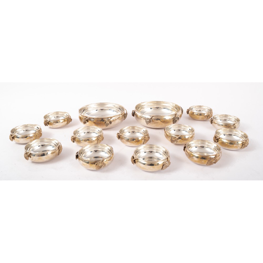SET MACEDONIA in argento composto da due coppe e dodici coppette con applicazioni in argento raffiguranti "Grappoli d'uva". Punzone argentiere 162 PA (g. 2840) (piccole ammaccature).