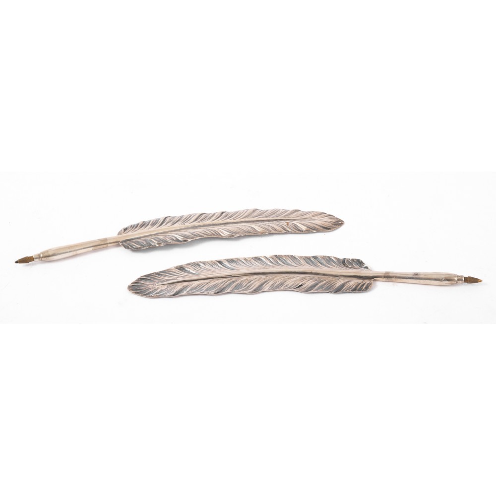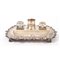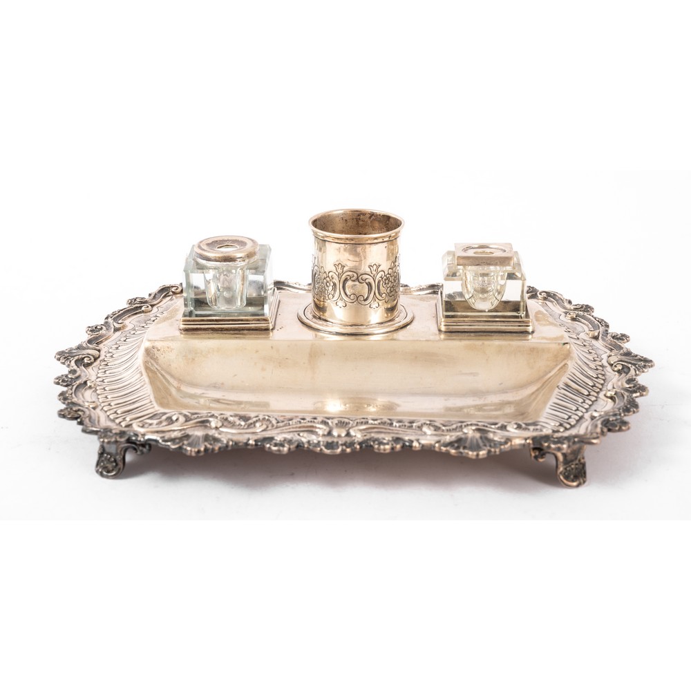 Calamaiera in argento lavorato e cesellato con due pennini e due boccette, presenta monogramma A.C. (gr. 1230 compreso pennini).