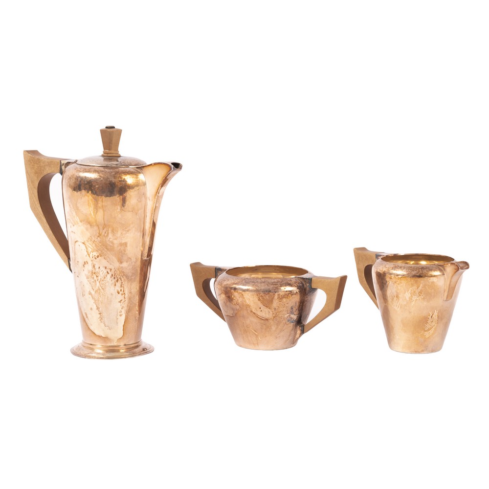 SERVIZIO in argento composto da caffettiera, lattiera e zuccheriera, manici in legno (g. 999 peso lordo).