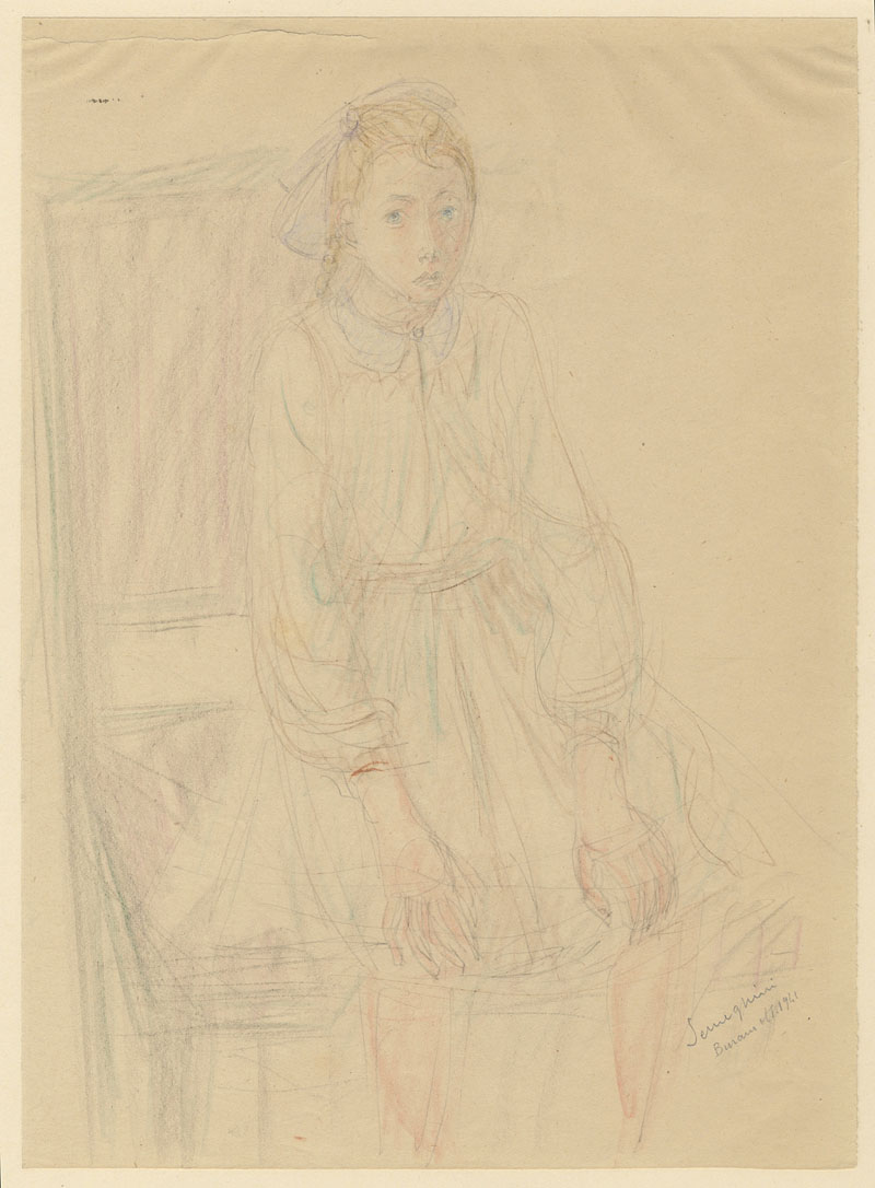 Pio Semeghini (1878-1964). Fanciulla seduta. 1941. Matite colorate su carta liscia avorio. mm 305x220. Firmato e datato «Burano ott. 1941» in basso a destra. Il disegno è corredato di autentica di Pleiadi Arte, firmata in data 2008. Il foglio, parzialmente applicato ad un cartoncino di supporto, è strappato al margine superiore, ma il disegno è intatto.