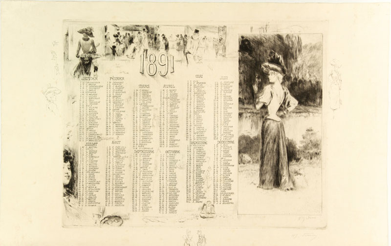 François Clément Sommier (1844-1907). Calendario per l'anno 1891. Puntasecca mm. 263x343. Foglio mm. 318x495. Firmata nella lastra in basso a destra e controfirmata sotto a matita. Esemplare su carta japon recante ai margini alcuni schizzi a penna eseguiti dall'artista a guisa di remarques. Noto illustratore di giornali e riviste, Somm fu anche finissimo incisore, particolarmente votato all'esecuzione di menu, inviti e carte da visita. Come pittore partecipò alla quarta esposizione degli impressionisti.  Aderì pienamente allo spirito fumiste e corrosivo dell'avanguardia fin-de-siècle. Nel 1885 con Georges Auriol animò il celebre cabaret Le Chat Noir con un loro teatro di marionette e nel 1893 insieme a Steinlen e Utrillo espose a Chicago rappresentando il loro teatro d'ombre. Bellissima impressione e ottima conservazione.