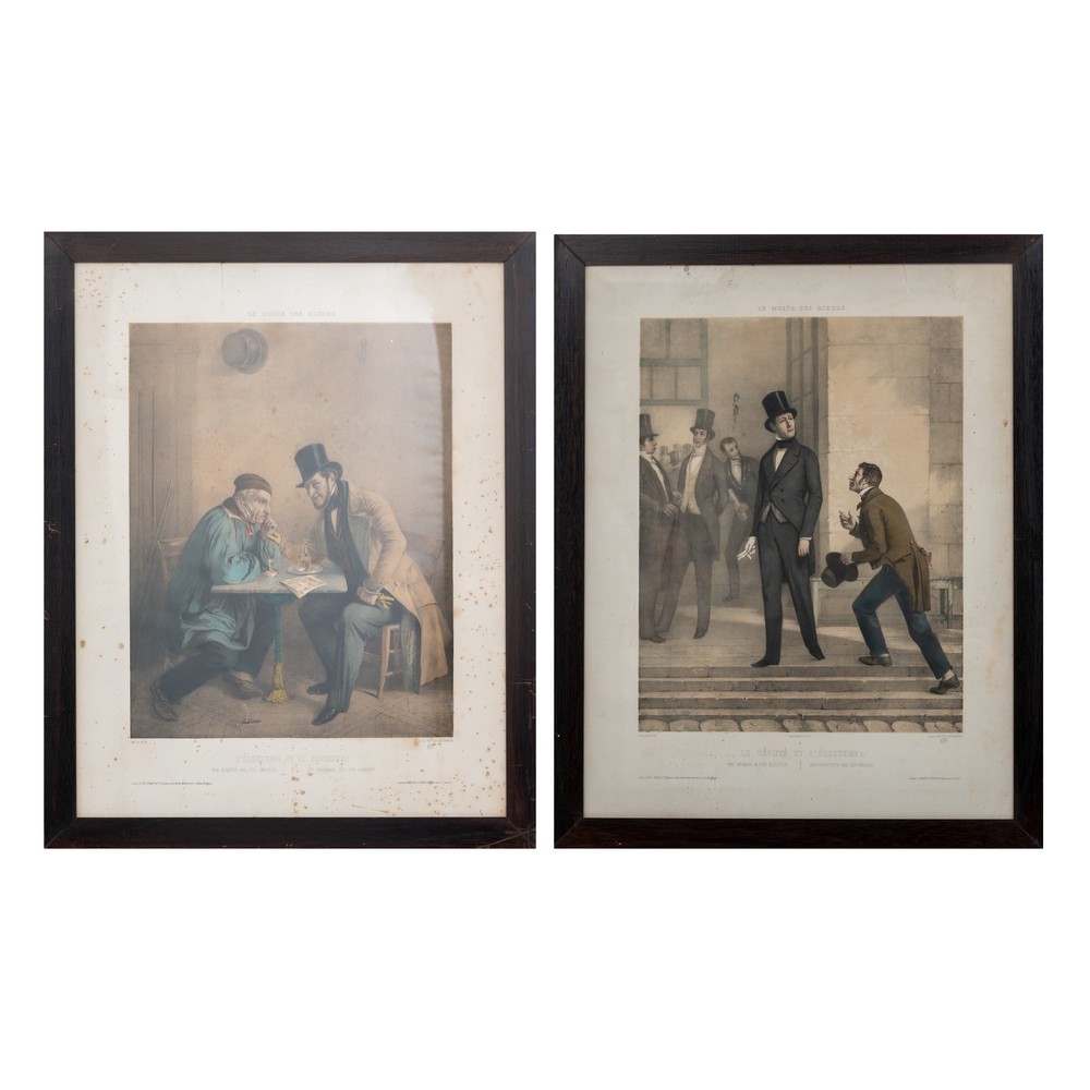 COPPIA DI STAMPE a colori raffiguranti "Personaggi - Il deputato e l'elettore" entro cornici in mogano.