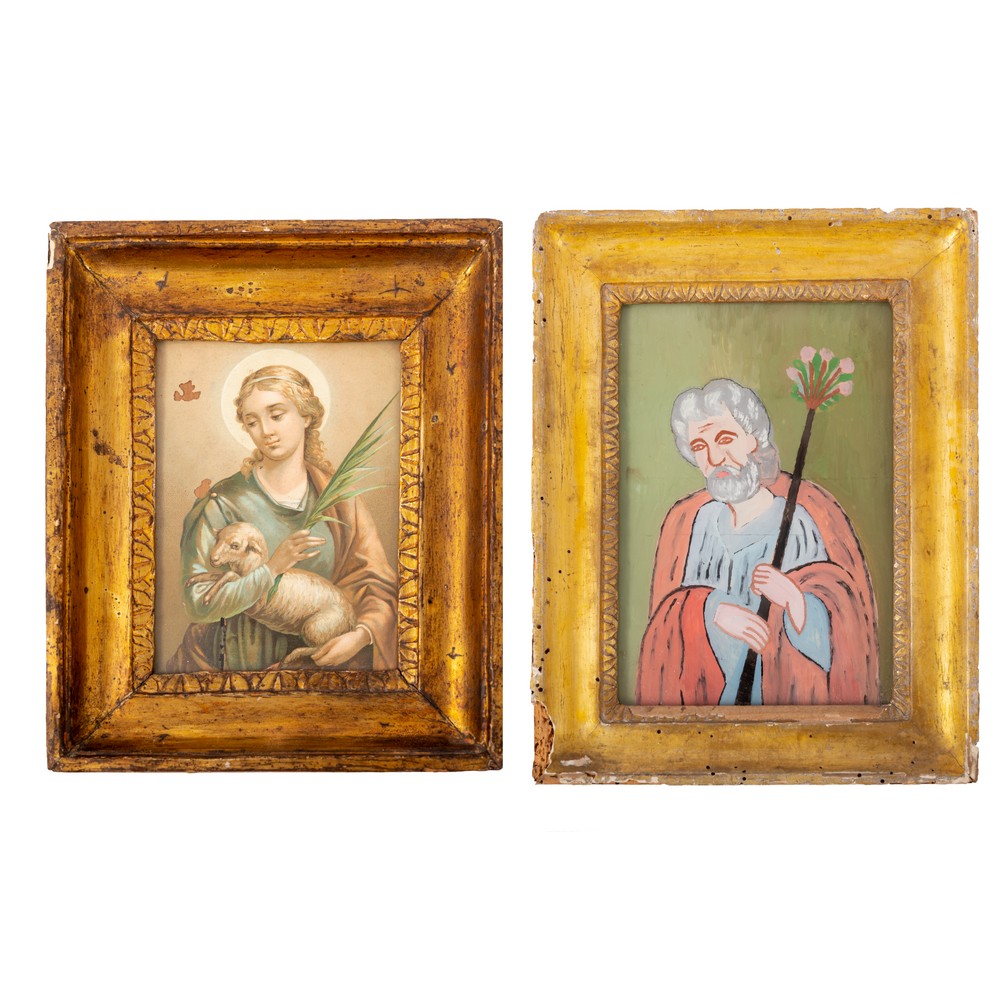 DUE PICCOLE CORNICI dorate ad argento e mistura con all'interno una stampa raffigurante Sant'Agnese e una pittura su vetro raffigurante San Giuseppe.