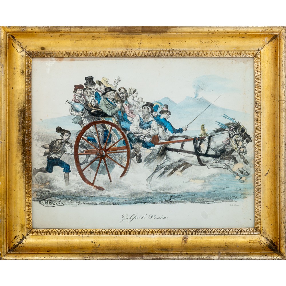 CORNICE a canna ciaccata in legno dorato ad argento a mecca con incisione a colori (Wenzel, Roma 1791 - 1880)