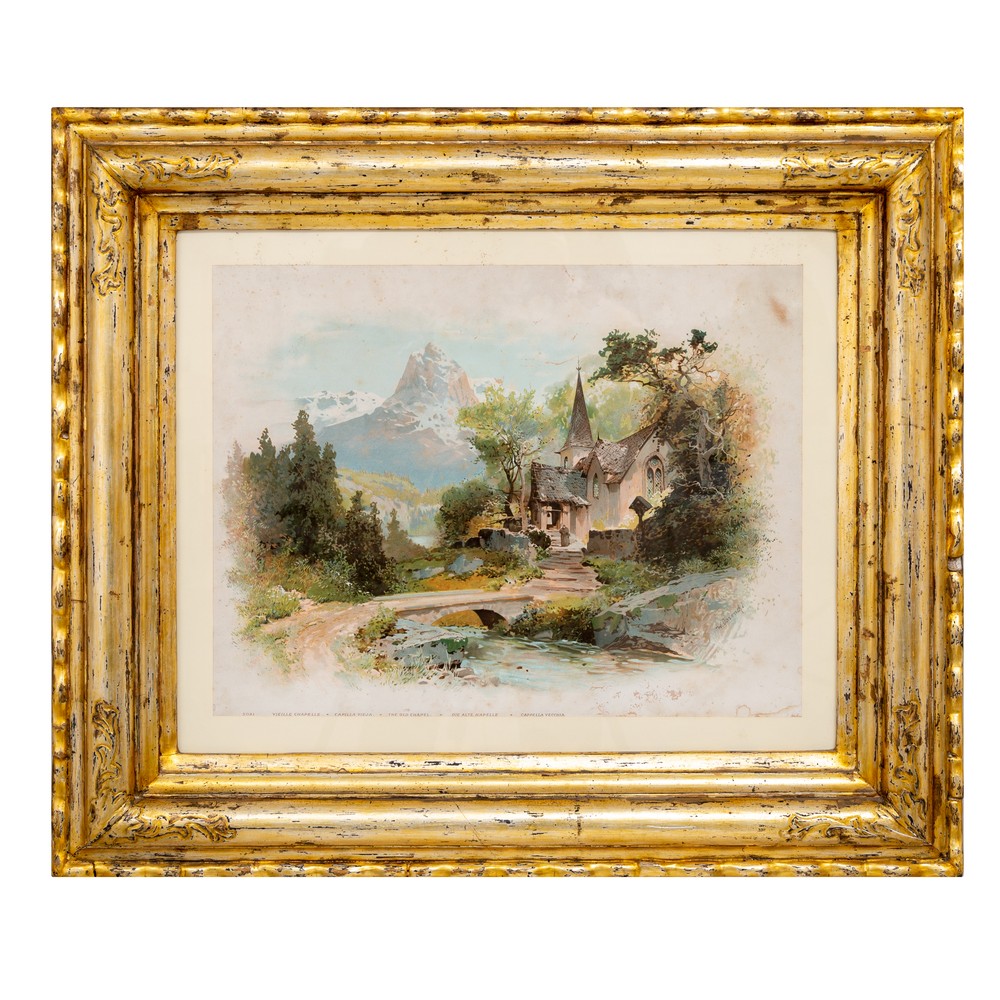 CORNICE in legno dorato ad argento a mecca con stampa a colori raffigurante “Paesaggio”.