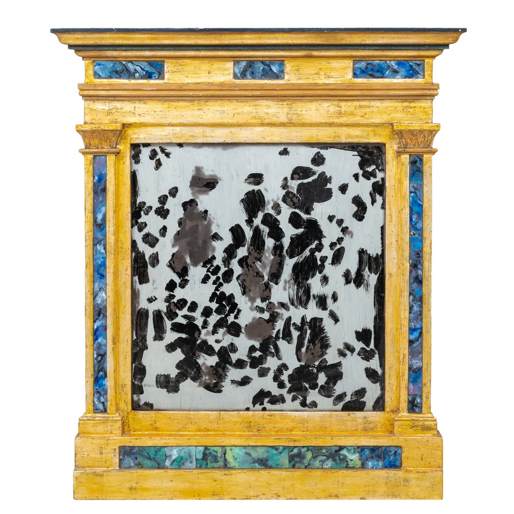 SPECCHIERA stile Luigi XVI in legno dorato ad argento a mecca con inserti vitrei decorati a finto marmo.