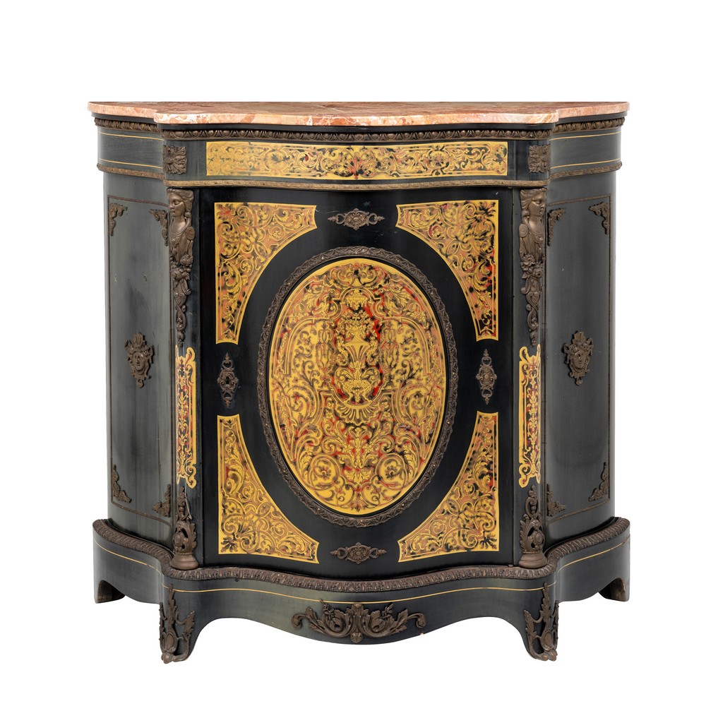 CREDENZA sagomata stile Boulle, con tarsie a finta tartaruga e rame, fregi in bronzo, piano in marmo rosso venato.