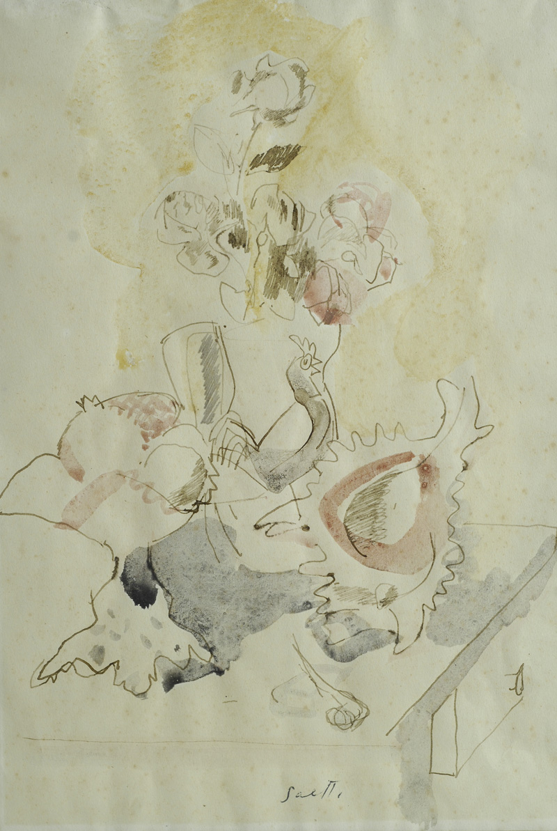 Bruno Saetti (Bologna, 1902 - 1984) NATURA MORTA Tecnica mista su carta, cm. 32x22 Firma in basso al centro.