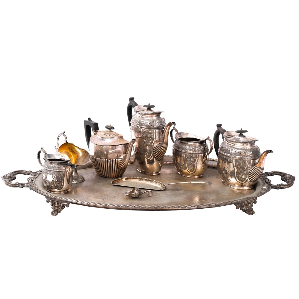 Vassoio, caffettiera, teiera, lattiera, zuccheriera, portazollette e un raccogli briciole.