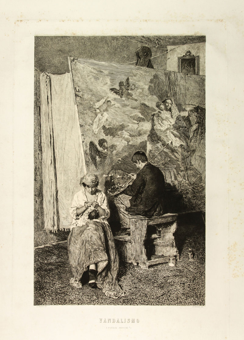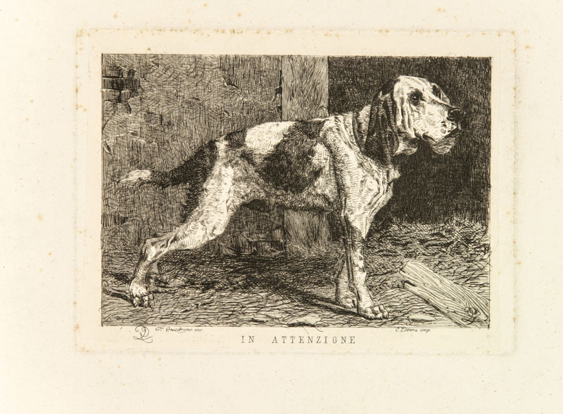Celestino Turletti (1845-1904). Vandalismo (Poveri antichi!). Da un dipinto di Giacomo Favretto. Acquaforte mm. 580x370. Foglio: mm. 890x640. Titolo in basso a centro. Sotto: "C. Lovera imp.". In basso ai lati: "C. Turletti inc. - G. Favretto dip.". Unito: Id., I miei modelli. Acquaforte mm. 510x375. Foglio: mm. 890x630. Titolo in basso a centro. Sotto: "C. Lovera imp.". In basso ai lati: "Vincenzo Volpe dip. - C. Turletti inc.". Unito: Quadrone Giovanni Battista. In attenzione, 1870. Acquaforte impressa su carta di Cina applicata su carta forte mm. 120x160. Foglio: mm. 265x360. Titolo in basso al centro. Ai lati: "G.ni Quadrone inc. - C. Lovera imp.". Da "L'Arte in Italia", maggio 1870, tav. 13. GIUBBINI, p. 250 num. 1 e fig. 319. L'opera rappresenta un cane da caccia e spetta, sia per l'invenzione che per l'esecuzione, ad uno dei più noti e quotati pittori piemontesi del secondo Ottocento, celebre per i suoi soggetti venatori e assai dotato come disegnatore di figure. Sporadiche ossidazioni e lievi difetti marginali ai primi due fogli; foxing un po' più accentuato nei margini del terzo.