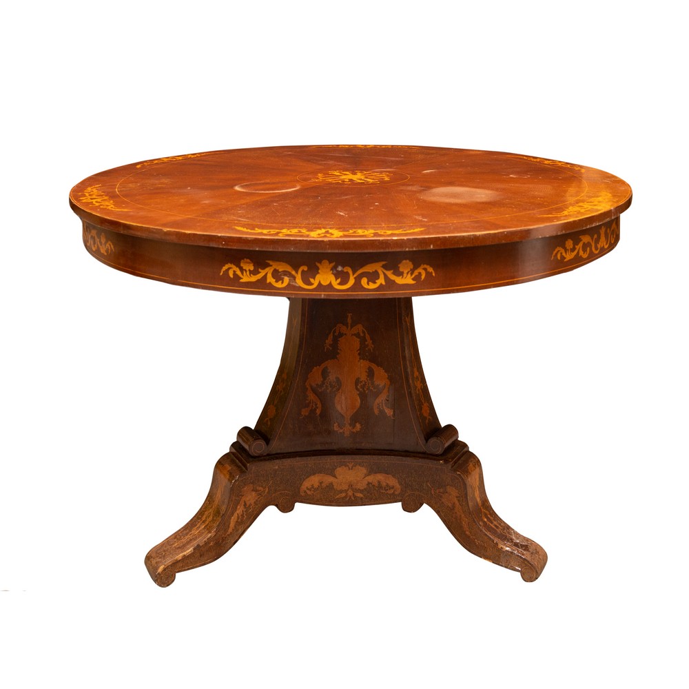 Tavolo da centro stile Carlo X in legno di mogano con tarsie in bosso.