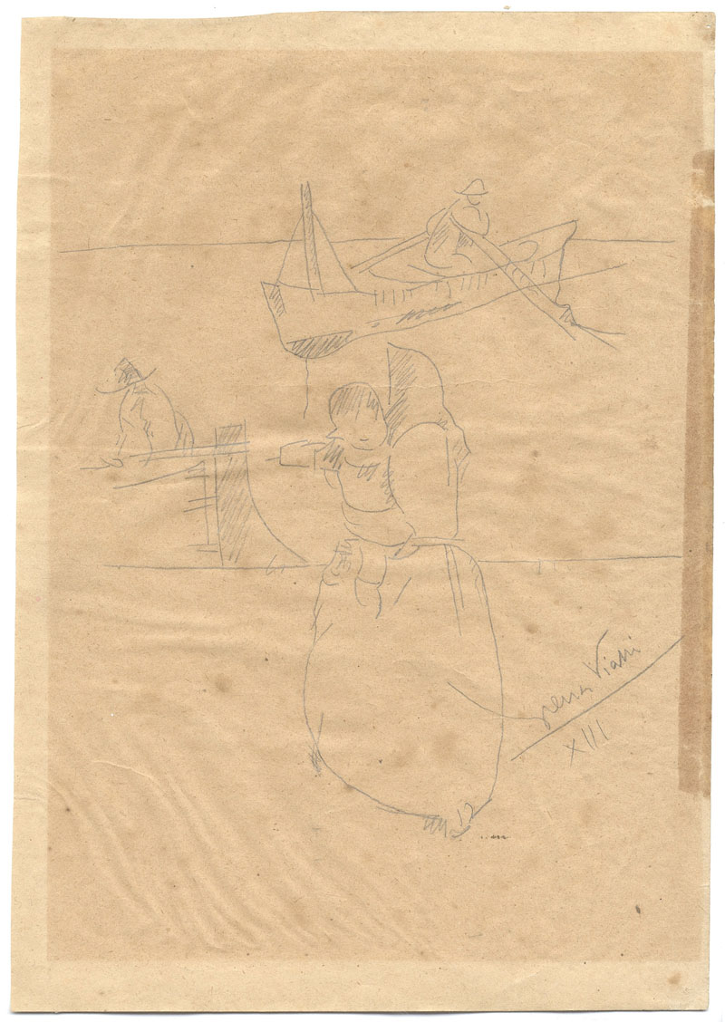 Lorenzo Viani (1882-1936). Sul molo. 1913. Matita di grafite su carta. mm 290x205. Firmato e datato a matita in basso a destra. Ossidazione della carta e traccia di vecchio adesivo al margine destro. Al verso lievi spellature della carta dovute ad un antico montaggio.