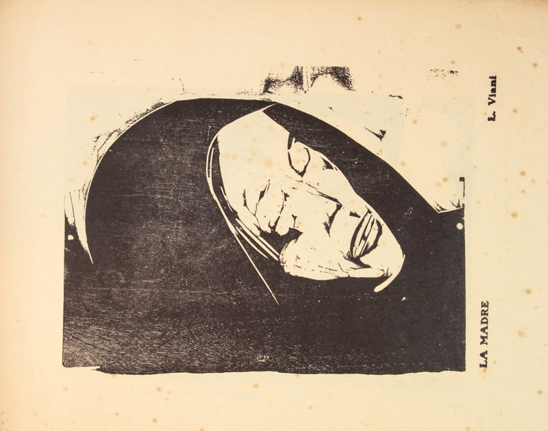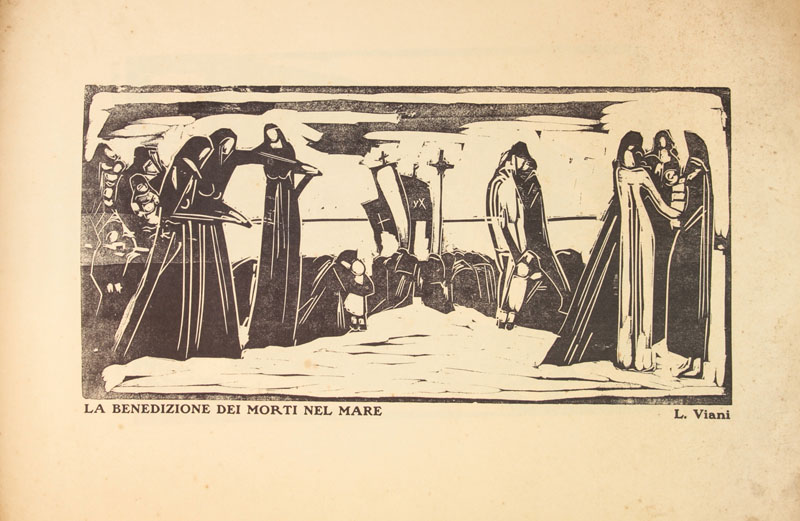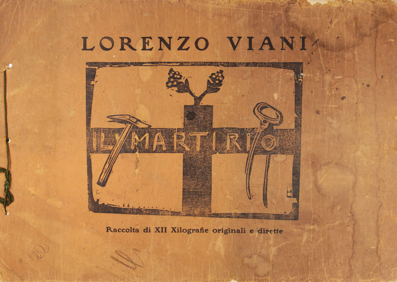 Lorenzo Viani (1882-1936). Il martirio. 1915. Album in-4° oblungo (mm 350x500). Brossura originale color arancione con illustrazioni xilografiche dell'autore (Il Martirio sulla prima di copertina e dati editoriali con figura alla seconda di copertina), legatura con corda verde. Contiene 8 (su 12) xilografie tratte, come da prefazione dell'autore, dal suo quadro La benedizione dei morti nel mare: La Benedizione dei morti in mare - La cattiva notizia - Il vicinato - Il ritorno - La madre - Particolare del naufrago - L'attesa - La preghiera - (Madre con bambino) pagina della prefazione (con firma autografa dell'autore). Numerosi difetti alla brossura (strappi, lacune, sgorature, macchie), piatto posteriore staccato. Le tavole si presentano in condizioni discrete, con difetti di usura ai margini e alcune tracce di fioriture.