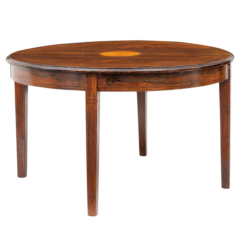 TAVOLINO di forma circolare in legno di palissandro con tarsie in bosso.