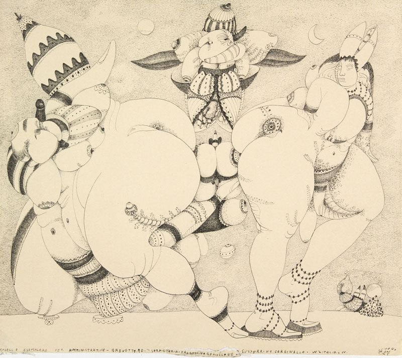 Tono Zancanaro (1906-1985). Tre figure satiriche. 1945. China a tratto mm. 280x318. In basso a penna: "Modello esemplare per Amministrative – Brevetto 90. 'Sora Gnazia – Fra Gostino gemellone – Susterrino Cardinallo'. W l'Italia = W". Firmato e datato in basso a destra: "76 Tono nov. 45". Raro disegno, di poco successivo, ma affine, alle figure abnormi e grottesche del Gibbo. Uno strappo in corrispondenza del centro della didascalia, ma senza perdita di testo grazie a un fermo di nastro adesivo. Tracce di adesivo sui bordi al verso del foglio.