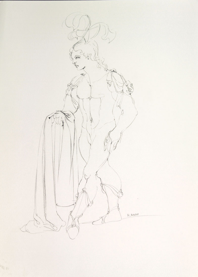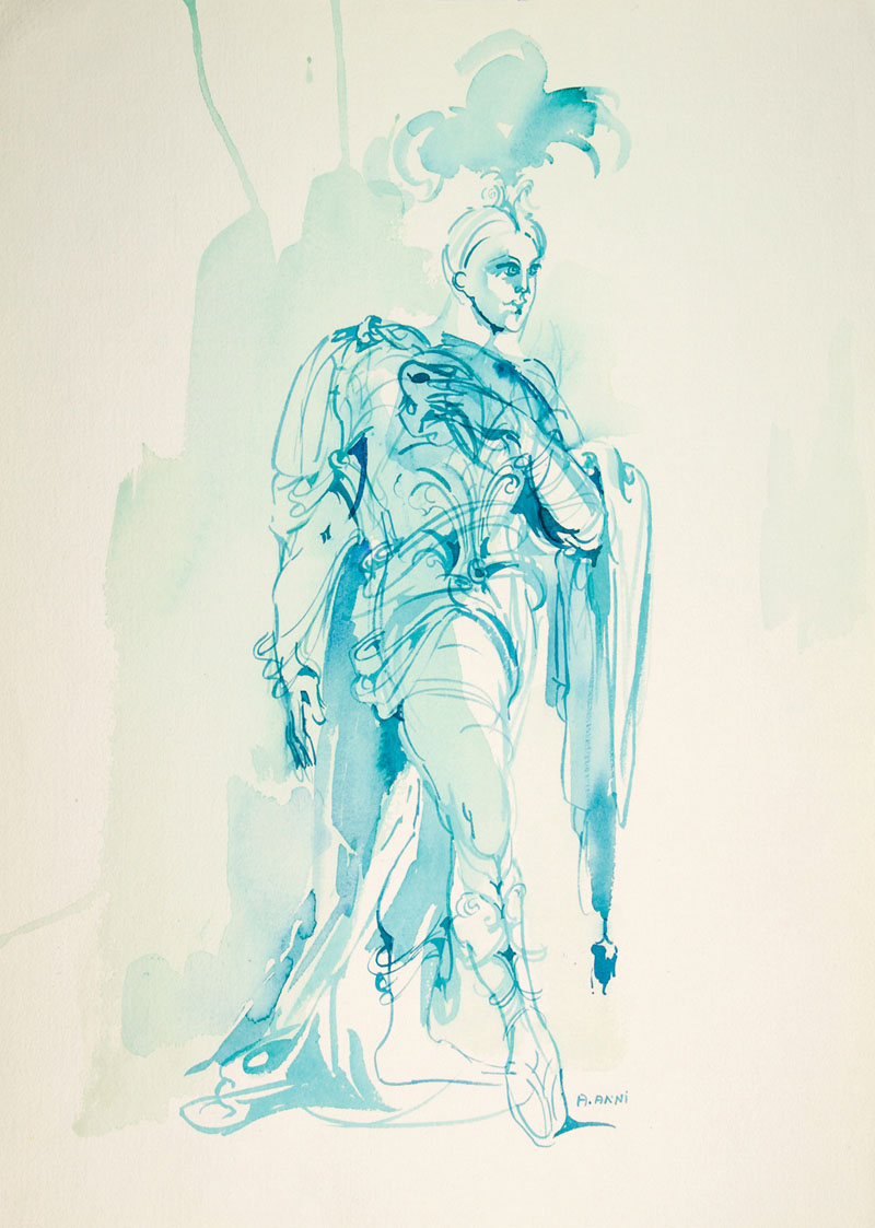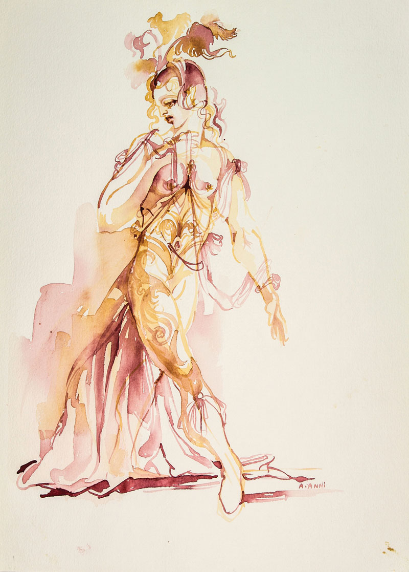 Anna Anni (1926-2011). Tre bozzetti per costumi teatrali. 1960 ca. Lotto composto da 3 disegni ad acquerello policromo e matita di grafite su cartoncino avorio. mm 500x360 (ciascuno). Tutti firmati in basso a destra. Ottima conservazione.