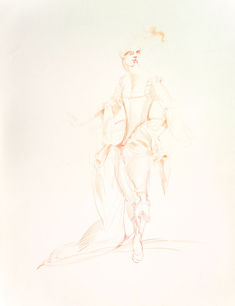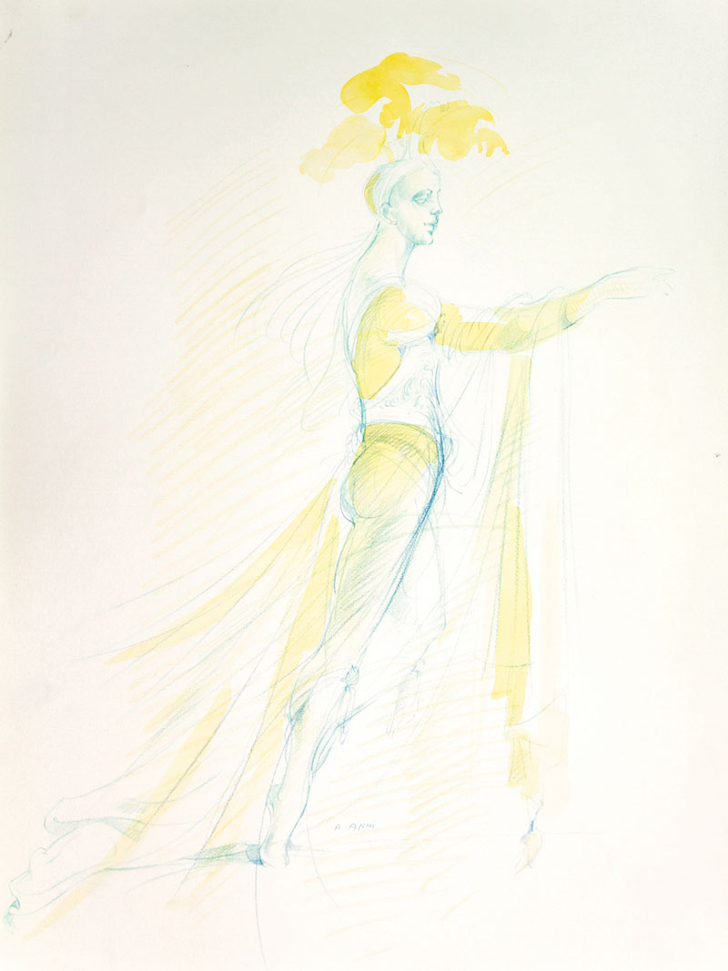 Anna Anni (1926-2011). Tre bozzetti per costumi teatrali. 1960 ca. Lotto composto da 3 disegni ad acquerello policromo e matita colorata su cartoncino avorio. mm 625x460 (ciascuno). Due disegni firmati in basso a destra. Uno non firmato e disegnato anche al verso. Ottima conservazione.