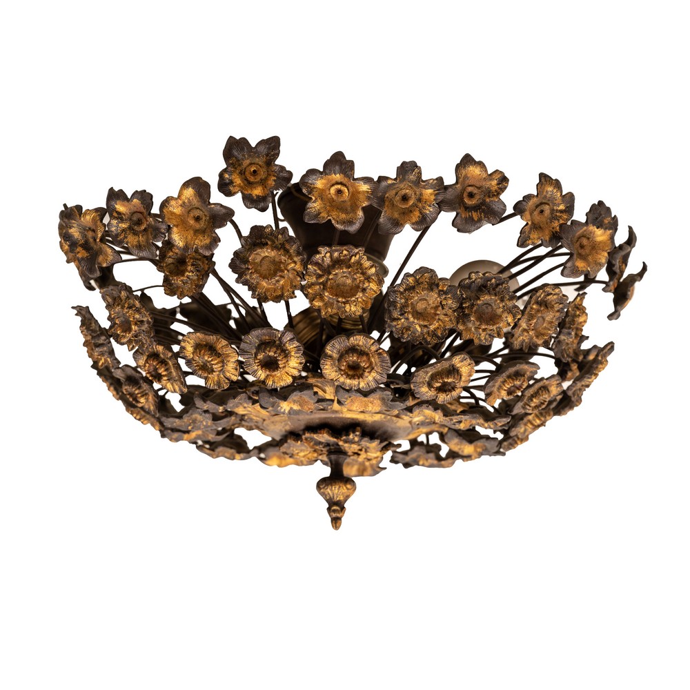 PLAFONIERA in bronzo dorato a tre luci a disegno floreale.