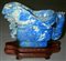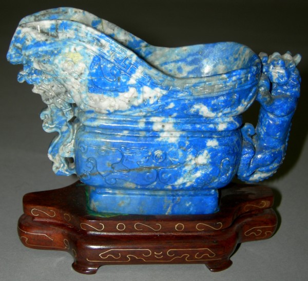 Versatoio in lapislazzulo con manico a forma di felino, montato su base di legno. Cina. XX secolo. Mis. Lung. cm. 12 Alt. cm. 10 ca.