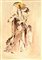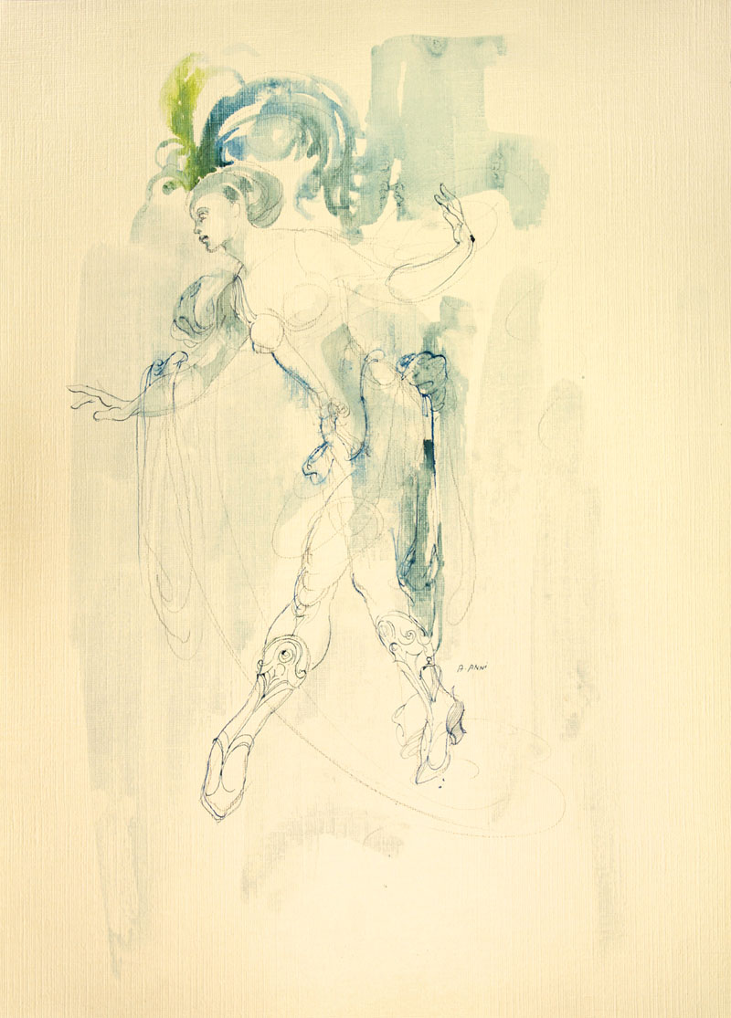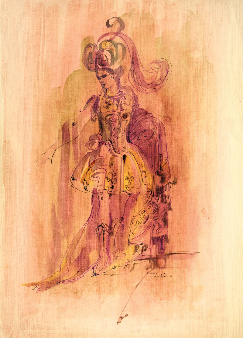 Anna Anni (1926-2011). Tre bozzetti per costumi teatrali. 1960 ca. Lotto composto da 3 disegni, matite e inchiostri colorati e acquerello su cartoncino vergato. mm 700x500 (ciascuno). Due disegni firmati in basso a destra e uno non firmato ma annotato «studio per un balletto». Ottima conservazione.