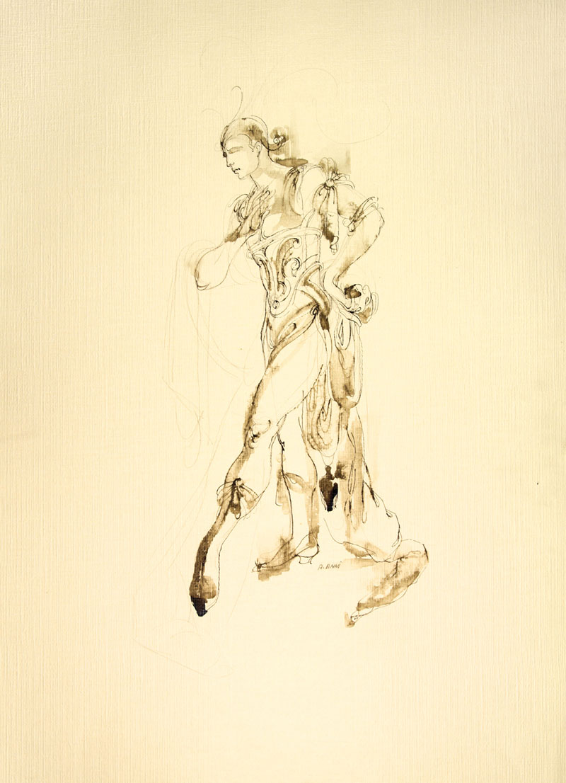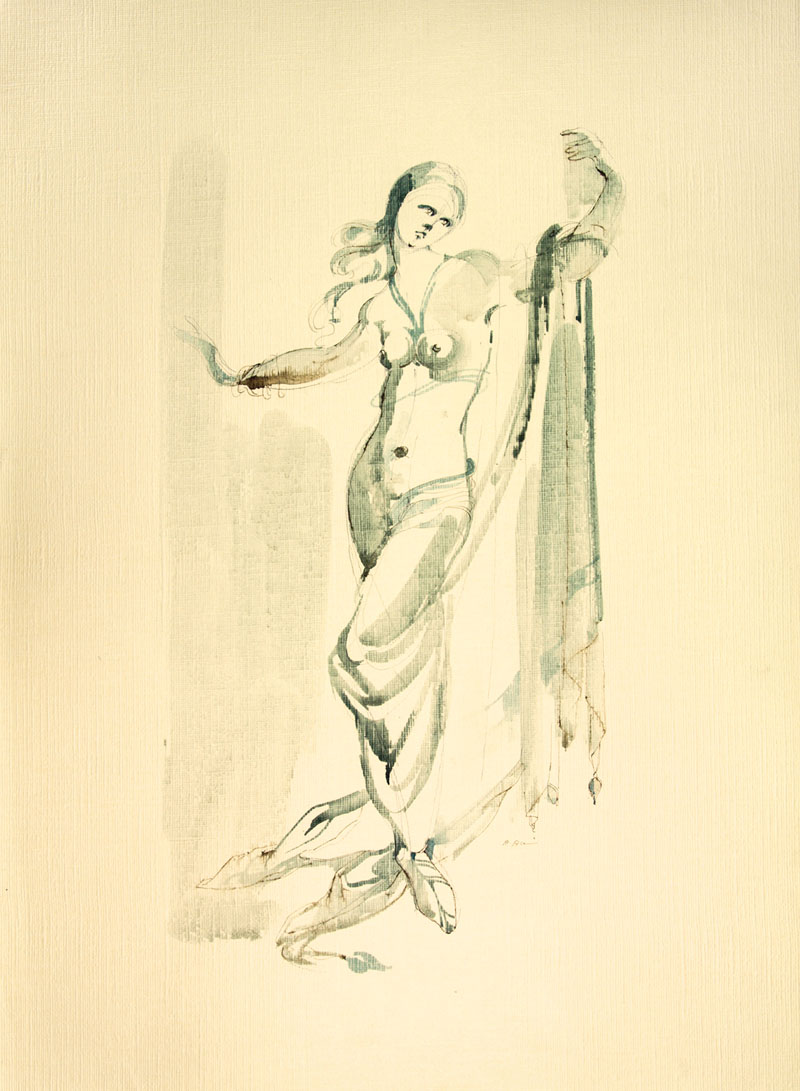 Anna Anni (1926-2011). Tre bozzetti per costumi teatrali. 1960 ca. Lotto composto da 3 disegni  a matita, inchiostri colorati e acquerello su cartoncino vergato. mm 700x500 (ciascuno). Tutti firmati in basso a destra. Ottima conservazione.